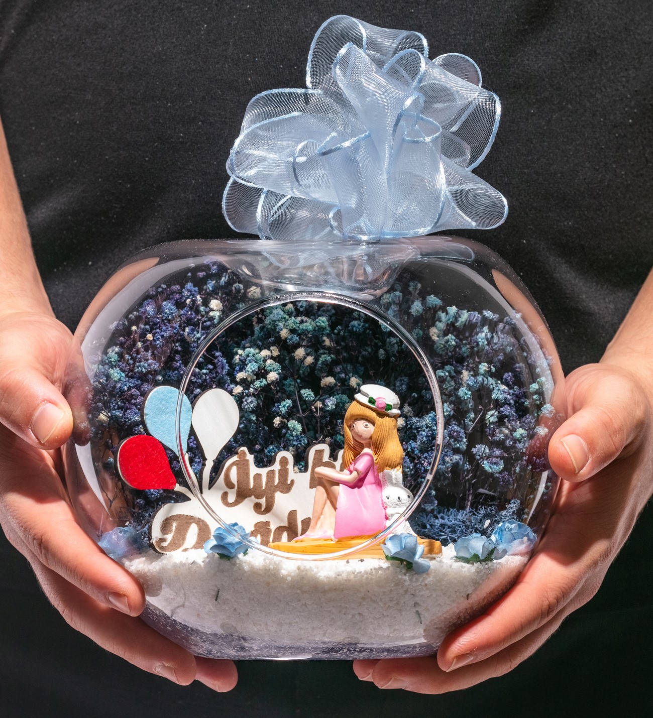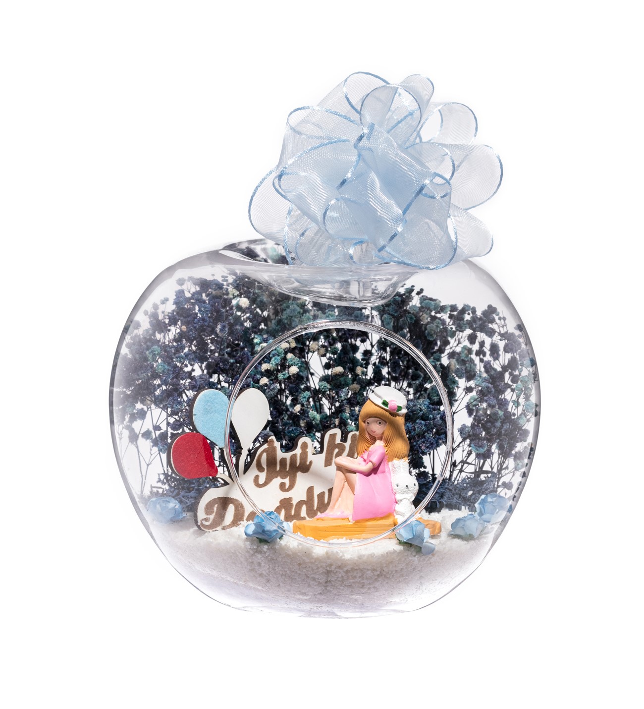 Küçük boy elma cam fanus içerisinde tasarladığımız bu kurdeleli teraryum; beyaz kum, yapay mini güller, kurutulmuş bitkilerle beraber bir adet İYİ Kİ DOĞDUN yazılı ahşap balonlu tabela ve bir adet bayan objeyle tamamlanmıştır. Ev ve ofis ortamlarının tamamında sergilenebilir teraryumun içinde, kurutulmuş bitkiler bulunduğundan hava alması önemlidir. Açık olan kısmının kapatılmaması veya büfe vb. kapalı alanlara konulmaması gereklidir. Özellikle her ortamda, zevkle izlenebilecek çok özel bir teraryumdur. Yaklaşık Ölçüleri: 20x20cm NOT: Teraryumlarda kullanılan camlar, üfleme cam işçiliğiyle üretildiğinden bazı detaylarda farklılıklar gözlenebilir. Örneğin, sap kısmı ve ağız bitiş noktalarının her biri kendine özgüdür.