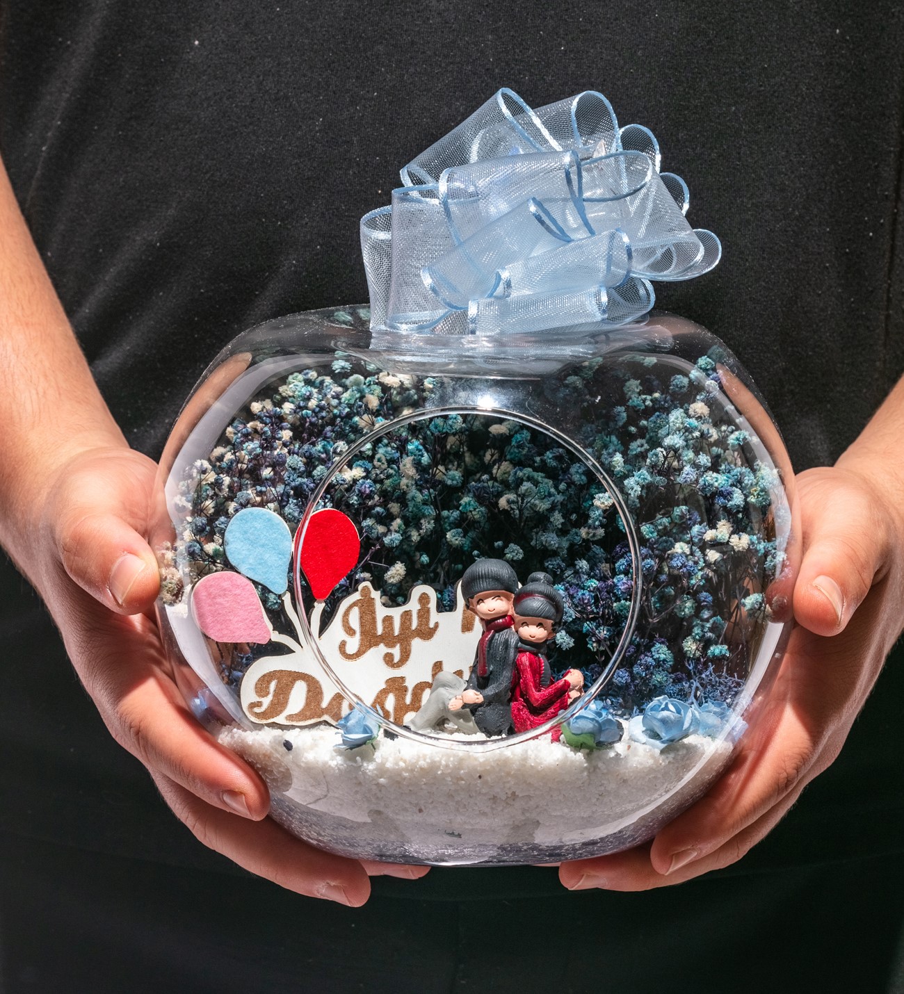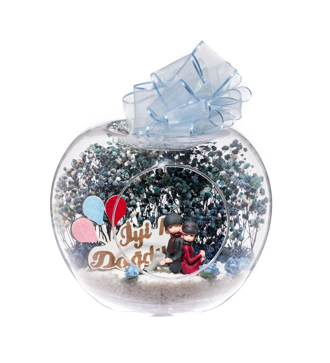 Küçük boy elma cam fanus içerisinde tasarladığımız bu kurdeleli teraryum; beyaz kum, yapay mini güller, kurutulmuş bitkilerle beraber bir adet İYİ Kİ DOĞDUN yazılı ahşap balonlu tabela ve bir adet sırt sırta aşıkları simgeleyen objeyle tamamlanmıştır. Ev ve ofis ortamlarının tamamında sergilenebilir teraryumun içinde, kurutulmuş bitkiler bulunduğundan hava alması önemlidir. Açık olan kısmının kapatılmaması veya büfe vb. kapalı alanlara konulmaması gereklidir. Özellikle her ortamda, zevkle izlenebilecek çok özel bir teraryumdur. Yaklaşık Ölçüleri: 20x20cm NOT: Teraryumlarda kullanılan camlar, üfleme cam işçiliğiyle üretildiğinden bazı detaylarda farklılıklar gözlenebilir. Örneğin, sap kısmı ve ağız bitiş noktalarının her biri kendine özgüdür.