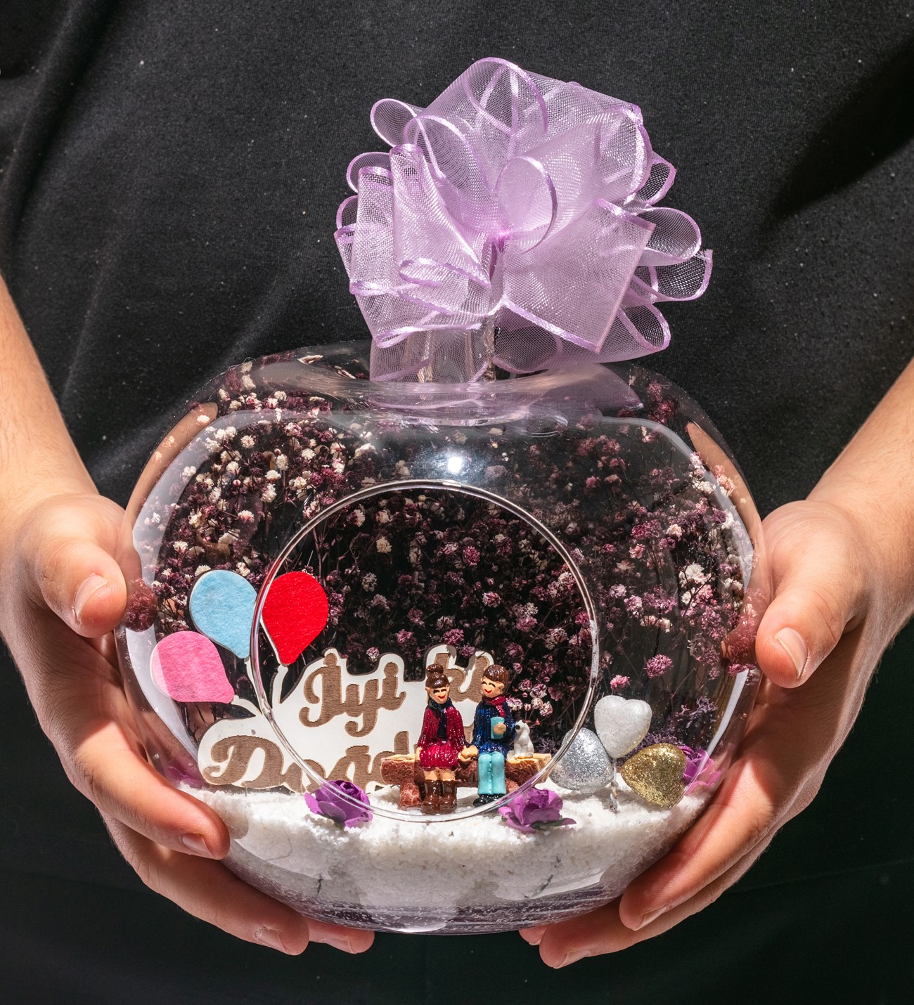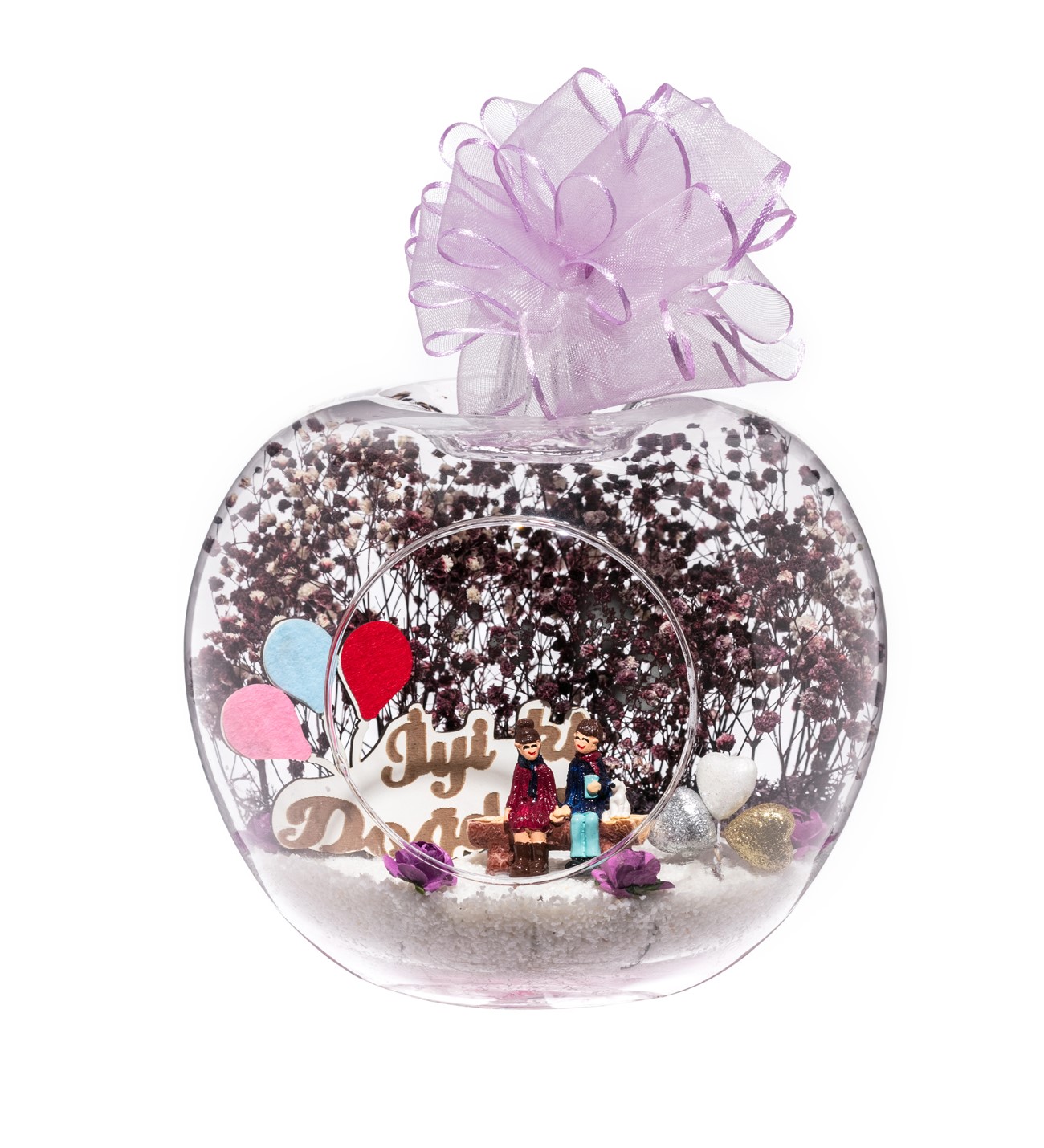 Küçük boy elma cam fanus içerisinde tasarladığımız bu kurdeleli teraryum; beyaz kum, yapay mini güller, renkli simli kalpler, kurutulmuş bitkilerle beraber bir adet İYİ Kİ DOĞDUN yazılı ahşap balonlu tabela ve bir adet yan yana aşıkları simgeleyen objeyle tamamlanmıştır. Ev ve ofis ortamlarının tamamında sergilenebilir teraryumun içinde, kurutulmuş bitkiler bulunduğundan hava alması önemlidir. Açık olan kısmının kapatılmaması veya büfe vb. kapalı alanlara konulmaması gereklidir. Özellikle her ortamda, zevkle izlenebilecek çok özel bir teraryumdur. Yaklaşık Ölçüleri: 20x20cm NOT: Teraryumlarda kullanılan camlar, üfleme cam işçiliğiyle üretildiğinden bazı detaylarda farklılıklar gözlenebilir. Örneğin, sap kısmı ve ağız bitiş noktalarının her biri kendine özgüdür.