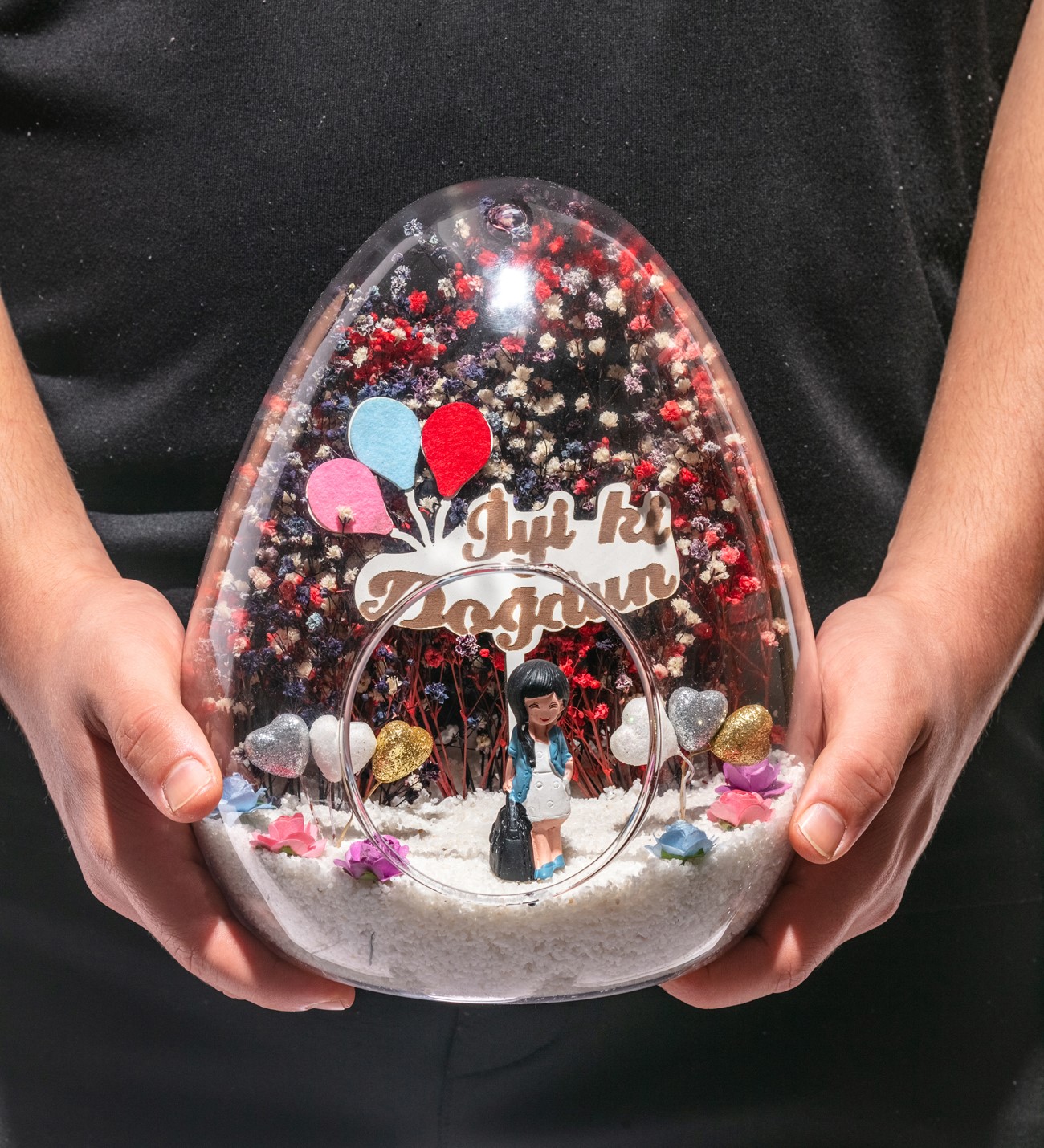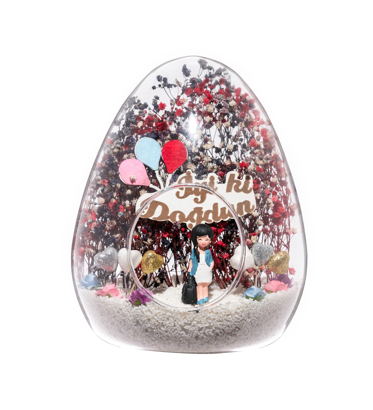 Küçük boy yumurta cam fanus içerisinde tasarladığımız bu özgün teraryum; beyaz kum, karışık renkli kurutulmuş bitkiler, renkli simli kalpler, renkli yapay mini güller, bir adet İYİ Kİ DOĞDUN yazılı ahşap balonlu tabela ve bayan obje kullanılarak tamamlanmıştır. Ev ve ofis ortamlarının tamamında sergilenebilir teraryumun içinde, kurutulmuş bitkiler olduğundan hava alması önemlidir. Açık olan kısmının kapatılmaması veya büfe vb. kapalı alanlara konulmaması gereklidir. Özellikle her ortamda, zevkle izlenebilecek özel bir teraryumdur. Yaklaşık Ölçüleri: 18x22cm NOT: Teraryumlarda kullanılan camlar, üfleme cam işçiliğiyle üretildiğinden bazı detaylarda farklılıklar gözlenebilir. Örneğin, ağız bitiş noktalarının her biri kendine özgüdür.