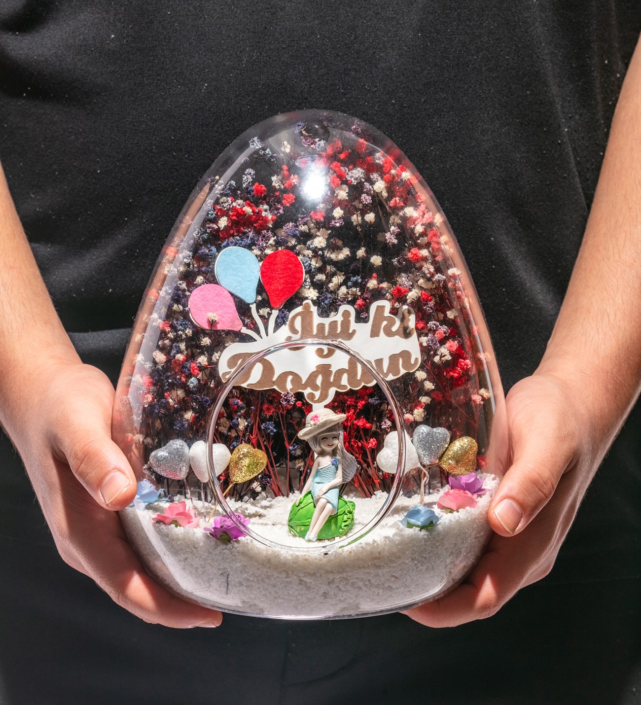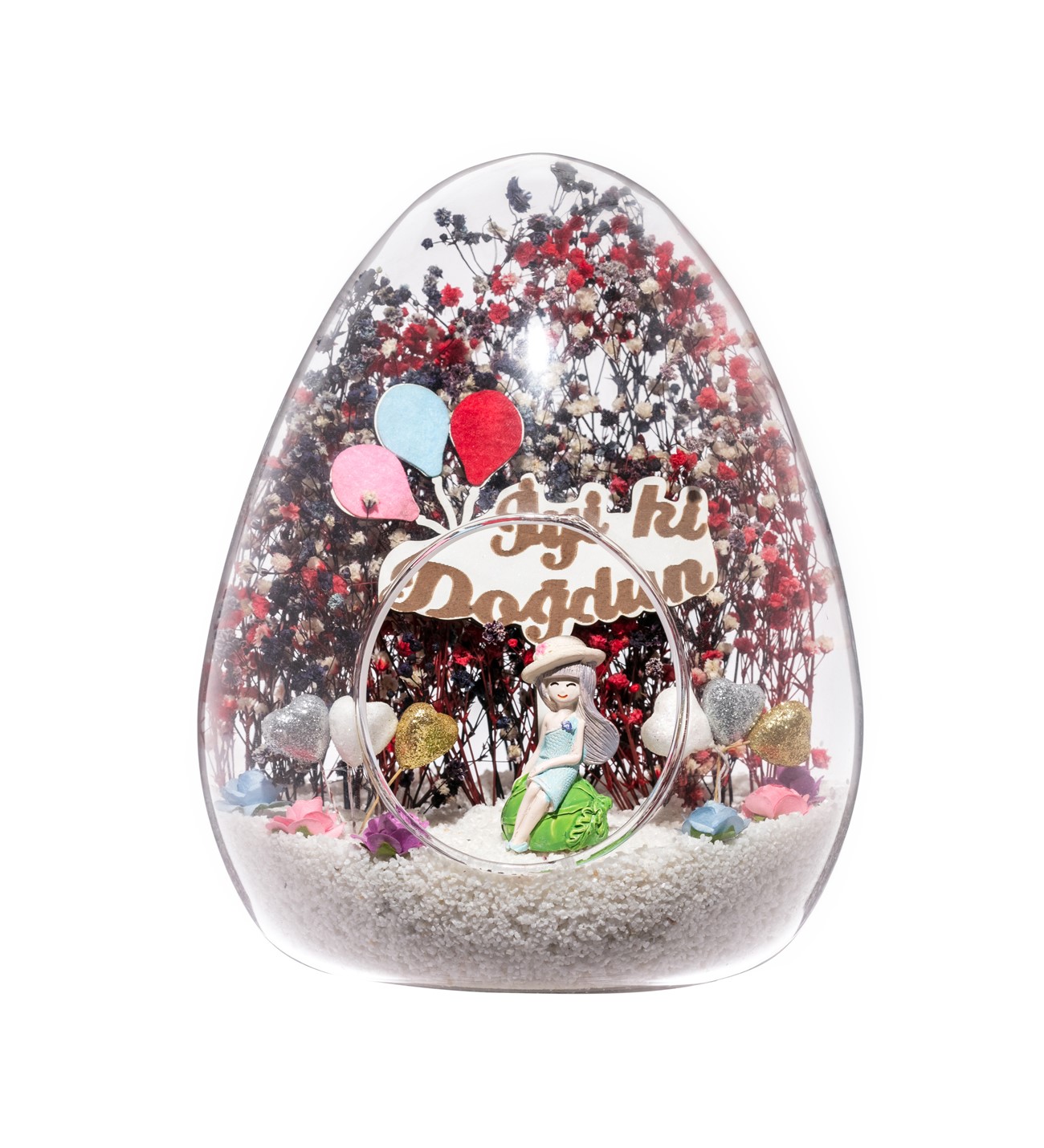 Küçük boy yumurta cam fanus içerisinde tasarladığımız bu özgün teraryum; beyaz kum, karışık renkli kurutulmuş bitkiler, renkli simli kalpler, renkli yapay mini güller, bir adet İYİ Kİ DOĞDUN yazılı ahşap balonlu tabela ve bayan obje kullanılarak tamamlanmıştır. Ev ve ofis ortamlarının tamamında sergilenebilir teraryumun içinde, kurutulmuş bitkiler olduğundan hava alması önemlidir. Açık olan kısmının kapatılmaması veya büfe vb. kapalı alanlara konulmaması gereklidir. Özellikle her ortamda, zevkle izlenebilecek özel bir teraryumdur. Yaklaşık Ölçüleri: 18x22cm NOT: Teraryumlarda kullanılan camlar, üfleme cam işçiliğiyle üretildiğinden bazı detaylarda farklılıklar gözlenebilir. Örneğin, ağız bitiş noktalarının her biri kendine özgüdür.