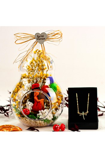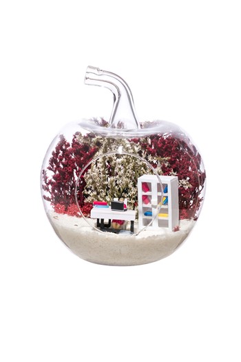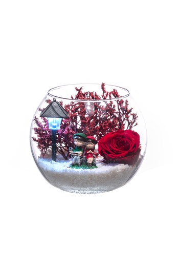 Küçük boy elma cam fanus içerisinde tasarladığımız bu kurdeleli teraryum; beyaz kum, yapay mini güller, kurutulmuş bitkilerle beraber bir adet İYİ Kİ DOĞDUN yazılı ahşap balonlu tabela ve bir adet bayan objeyle tamamlanmıştır. Ev ve ofis ortamlarının tamamında sergilenebilir teraryumun içinde, kurutulmuş bitkiler bulunduğundan hava alması önemlidir. Açık olan kısmının kapatılmaması veya büfe vb. kapalı alanlara konulmaması gereklidir. Özellikle her ortamda, zevkle izlenebilecek çok özel bir teraryumdur. Yaklaşık Ölçüleri: 20x20cm NOT: Teraryumlarda kullanılan camlar, üfleme cam işçiliğiyle üretildiğinden bazı detaylarda farklılıklar gözlenebilir. Örneğin, sap kısmı ve ağız bitiş noktalarının her biri kendine özgüdür.