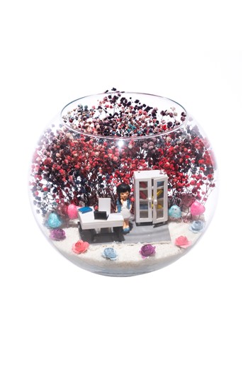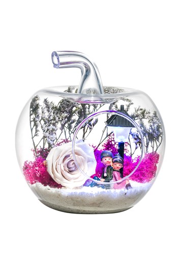 Küçük boy elma cam fanus içerisinde tasarladığımız bu kurdeleli teraryum; beyaz kum, yapay mini güller, renkli simli kalpler, kurutulmuş bitkilerle beraber bir adet İYİ Kİ DOĞDUN yazılı ahşap balonlu tabela ve bir adet bayan objeyle tamamlanmıştır. Ev ve ofis ortamlarının tamamında sergilenebilir teraryumun içinde, kurutulmuş bitkiler bulunduğundan hava alması önemlidir. Açık olan kısmının kapatılmaması veya büfe vb. kapalı alanlara konulmaması gereklidir. Özellikle her ortamda, zevkle izlenebilecek çok özel bir teraryumdur. Yaklaşık Ölçüleri: 20x20cm NOT: Teraryumlarda kullanılan camlar, üfleme cam işçiliğiyle üretildiğinden bazı detaylarda farklılıklar gözlenebilir. Örneğin, sap kısmı ve ağız bitiş noktalarının her biri kendine özgüdür.