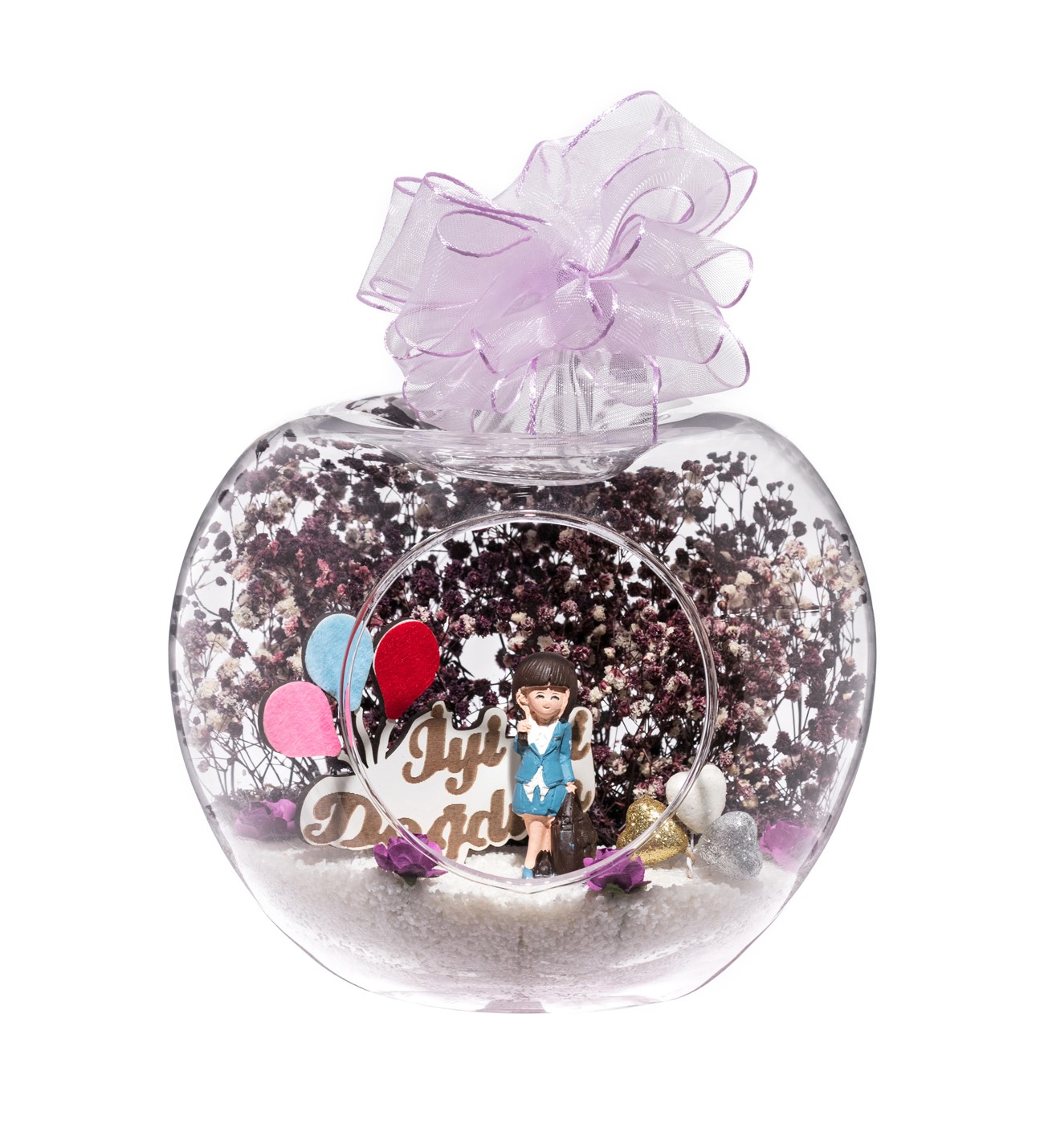 Küçük boy elma cam fanus içerisinde tasarladığımız bu kurdeleli teraryum; beyaz kum, yapay mini güller, renkli simli kalpler, kurutulmuş bitkilerle beraber bir adet İYİ Kİ DOĞDUN yazılı ahşap balonlu tabela ve bir adet bayan objeyle tamamlanmıştır. Ev ve ofis ortamlarının tamamında sergilenebilir teraryumun içinde, kurutulmuş bitkiler bulunduğundan hava alması önemlidir. Açık olan kısmının kapatılmaması veya büfe vb. kapalı alanlara konulmaması gereklidir. Özellikle her ortamda, zevkle izlenebilecek çok özel bir teraryumdur. Yaklaşık Ölçüleri: 20x20cm NOT: Teraryumlarda kullanılan camlar, üfleme cam işçiliğiyle üretildiğinden bazı detaylarda farklılıklar gözlenebilir. Örneğin, sap kısmı ve ağız bitiş noktalarının her biri kendine özgüdür.
