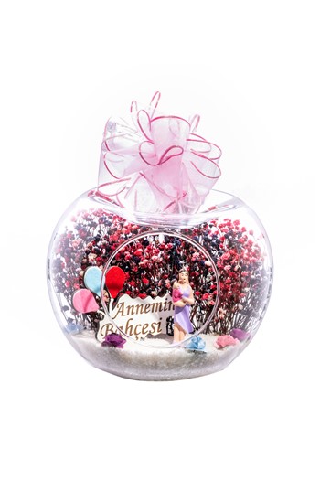 Küçük boy elma cam fanus içerisinde tasarladığımız bu kurdeleli teraryum; beyaz kum, yapay mini güller, renkli simli kalpler, kurutulmuş bitkilerle beraber bir adet İYİ Kİ DOĞDUN yazılı ahşap balonlu tabela ve bir adet bayan objeyle tamamlanmıştır. Ev ve ofis ortamlarının tamamında sergilenebilir teraryumun içinde, kurutulmuş bitkiler bulunduğundan hava alması önemlidir. Açık olan kısmının kapatılmaması veya büfe vb. kapalı alanlara konulmaması gereklidir. Özellikle her ortamda, zevkle izlenebilecek çok özel bir teraryumdur. Yaklaşık Ölçüleri: 20x20cm NOT: Teraryumlarda kullanılan camlar, üfleme cam işçiliğiyle üretildiğinden bazı detaylarda farklılıklar gözlenebilir. Örneğin, sap kısmı ve ağız bitiş noktalarının her biri kendine özgüdür.