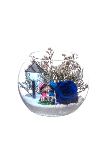 Küçük boy elma cam fanus içerisinde tasarladığımız bu kurdeleli güzel teraryum; beyaz kum, kurutulmuş bitkiler, şoklanmış yosunlar, yapay mini güller, bir adet mavi ahşap ev, bir adet üzerinde turtası ve kupalarıyla otantik ahşap sehpa ve sohbet eden iki genç kadını simgeleyen objeler kullanılarak tamamlanmıştır. Ev ve ofis ortamlarının tamamında sergilenebilir teraryumun içinde, kurutulmuş bitkiler bulunduğundan hava alması önemlidir. Açık olan kısmının kapatılmaması veya büfe vb. kapalı alanlara konulmaması gereklidir. Özellikle her ortamda yıllarca, zevkle izlenebilecek özel bir teraryumdur. Yaklaşık Ölçüleri: 20x20cm NOT: Teraryumlarda kullanılan camlar, üfleme cam işçiliğiyle üretildiğinden bazı detaylarda farklılıklar gözlenebilir. Örneğin, sap kısmı ve ağız bitiş noktalarının her biri kendine özgüdür.