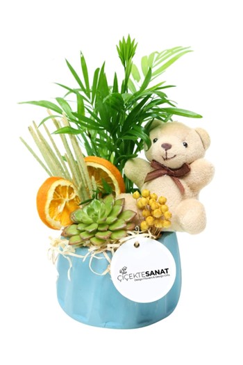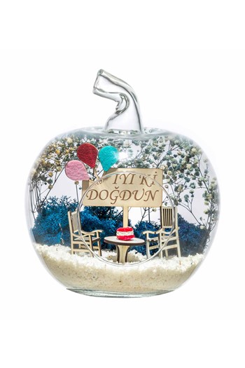 Küçük boy elma cam fanus içerisinde tasarladığımız bu kurdeleli güzel teraryum; beyaz kum, kurutulmuş bitkiler, şoklanmış yosunlar, yapay mini güller, bir adet mavi ahşap ev, bir adet üzerinde turtası ve kupalarıyla otantik ahşap sehpa ve sohbet eden iki genç kadını simgeleyen objeler kullanılarak tamamlanmıştır. Ev ve ofis ortamlarının tamamında sergilenebilir teraryumun içinde, kurutulmuş bitkiler bulunduğundan hava alması önemlidir. Açık olan kısmının kapatılmaması veya büfe vb. kapalı alanlara konulmaması gereklidir. Özellikle her ortamda yıllarca, zevkle izlenebilecek özel bir teraryumdur. Yaklaşık Ölçüleri: 20x20cm NOT: Teraryumlarda kullanılan camlar, üfleme cam işçiliğiyle üretildiğinden bazı detaylarda farklılıklar gözlenebilir. Örneğin, sap kısmı ve ağız bitiş noktalarının her biri kendine özgüdür.