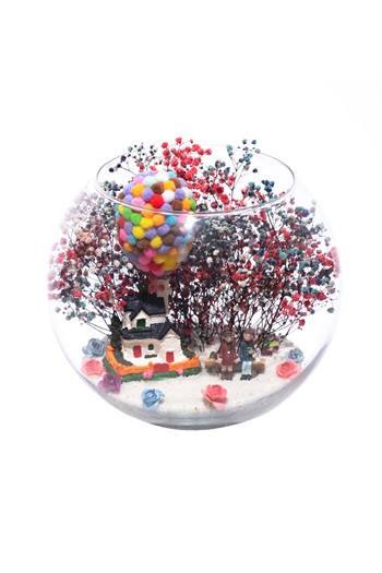Küçük boy elma cam fanus içerisinde tasarladığımız bu çok güzel teraryum; beyaz kum, karışık renkli kurutulmuş bitkiler, renkli mini yapay güller ve beraber gezintiye çıkmış iki adet genç kızı simgeleyen objeler kullanılarak tamamlanmıştır. Ev ve ofis ortamlarının tamamında sergilenebilir teraryumun içinde, kurutulmuş bitkiler bulunduğundan hava alması önemlidir. Açık olan kısmının kapatılmaması veya büfe vb. kapalı alanlara konulmaması gereklidir. Özellikle her ortamda yıllarca, zevkle izlenebilecek özel bir teraryumdur. Yaklaşık Ölçüleri: 20x20cm NOT: Teraryumlarda kullanılan camlar, üfleme cam işçiliğiyle üretildiğinden bazı detaylarda farklılıklar gözlenebilir. Örneğin, sap kısmı ve ağız bitiş noktalarının her biri kendine özgüdür.