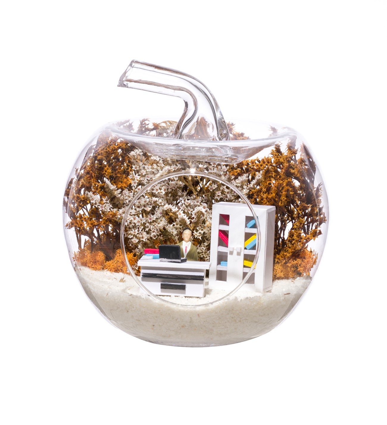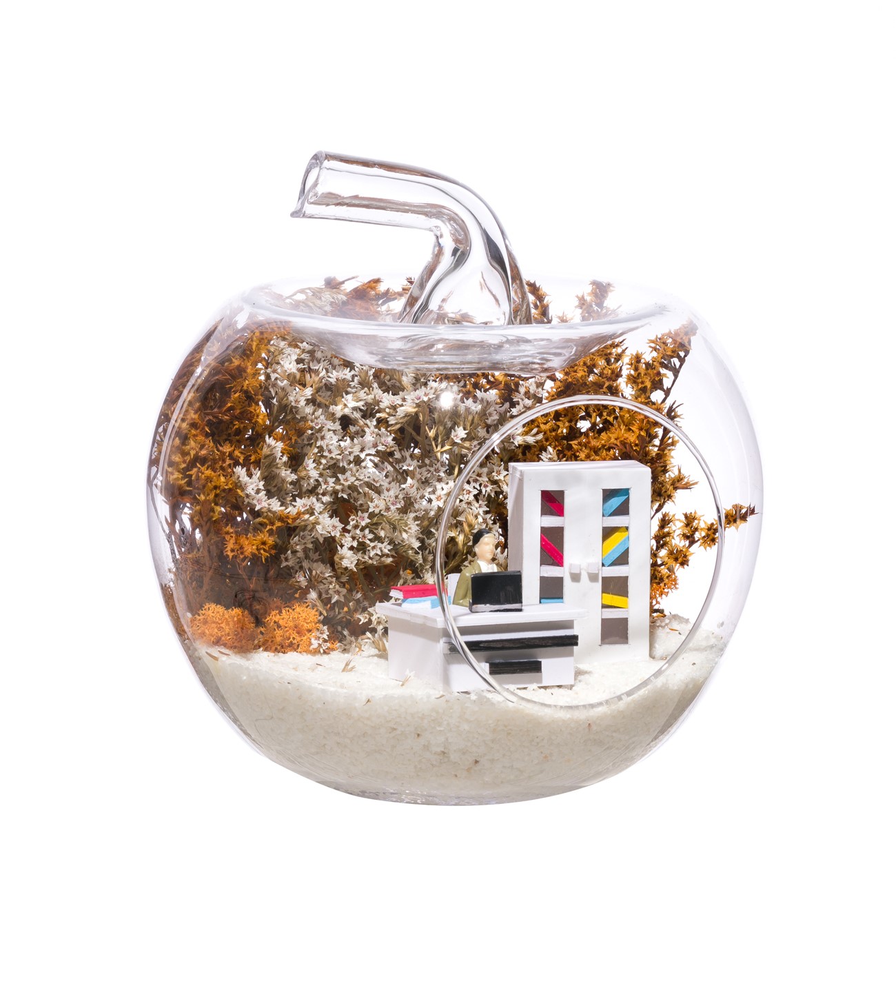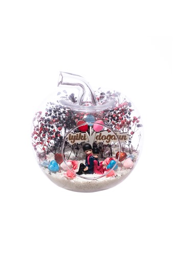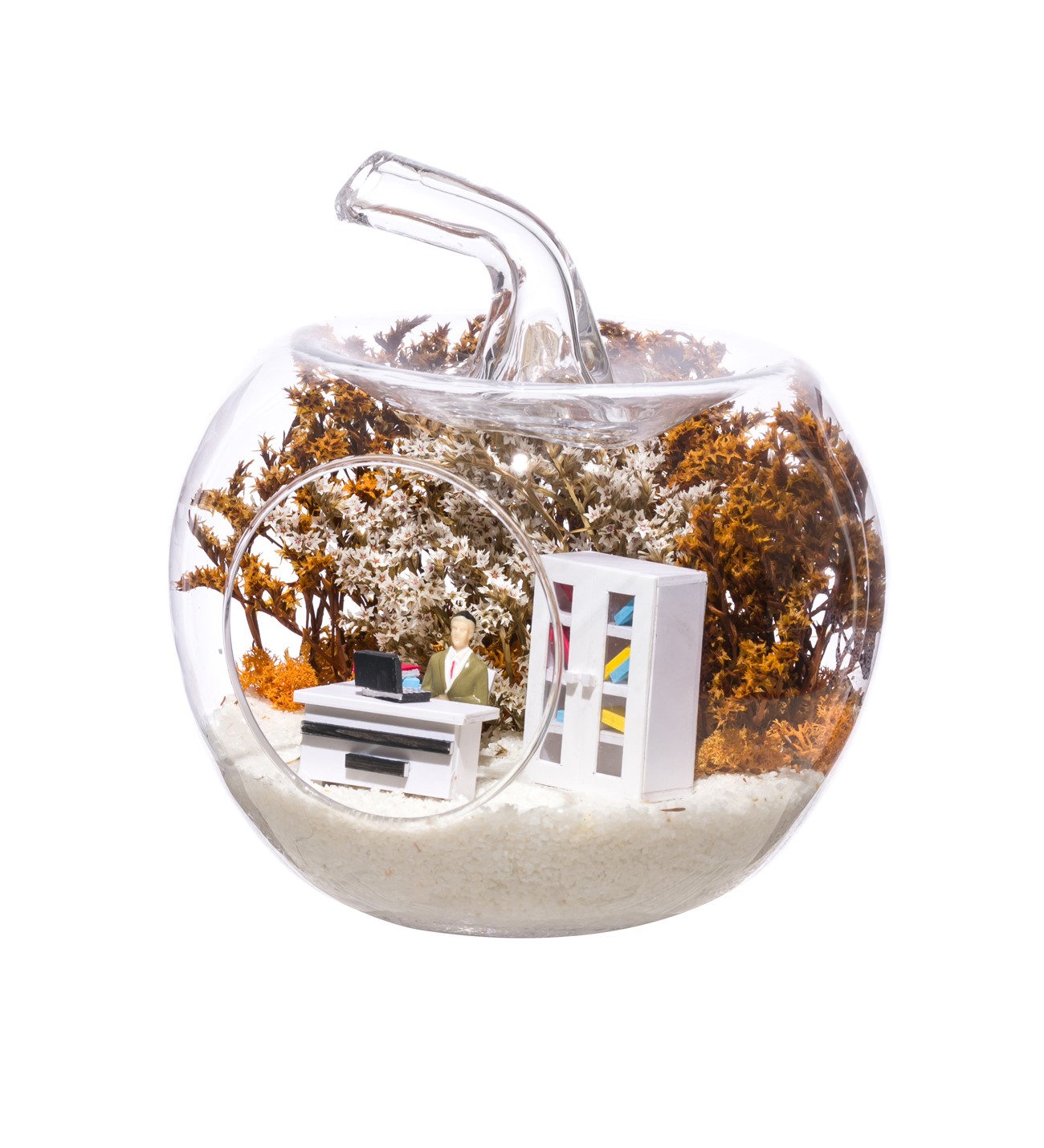 Küçük boy elma cam fanus içerisinde tasarladığımız bu çok güzel teraryum; beyaz kum, şoklanmış yosunlar, kurutulmuş bitkiler, bir adet el yapımı beyaz ofis görseli ve bir adet masasında çalışan erkek görseli kullanılarak tamamlanmıştır. Ev ve ofis ortamlarının tamamında sergilenebilir teraryumun içinde, kurutulmuş ve şoklanmış bitkiler bulunduğundan hava alması önemlidir. Açık olan kısmının kapatılmaması veya büfe vb. kapalı alanlara konulmaması gereklidir. Özellikle her ortamda yıllarca, zevkle izlenebilecek özel bir teraryumdur. Yaklaşık Ölçüleri: 20x20cm NOT: Teraryumlarda kullanılan camlar, üfleme cam işçiliğiyle üretildiğinden bazı detaylarda farklılıklar gözlenebilir. Örneğin, sap kısmı ve ağız bitiş noktalarının her biri kendine özgüdür.