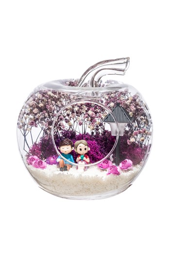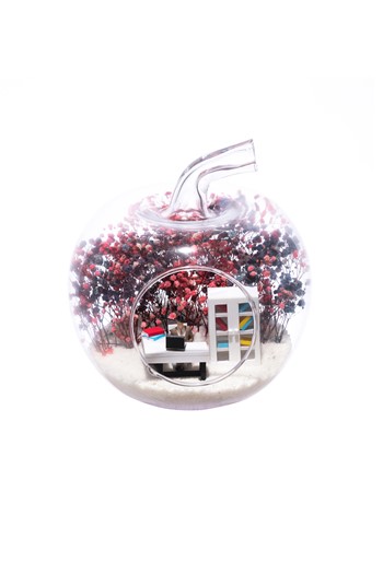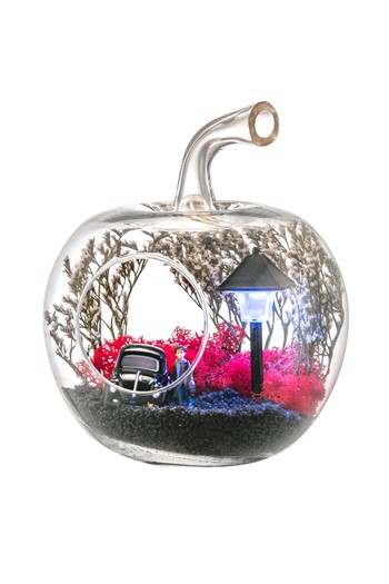 Küçük boy elma cam fanus içerisinde tasarladığımız bu çok güzel teraryum; siyah kum, şoklanmış yosunlar, kurutulmuş bitkiler, bir adet ahşap ofis görseli ve bir adet masasında çalışan erkek görseli kullanılarak tamamlanmıştır. Ev ve ofis ortamlarının tamamında sergilenebilir teraryumun içinde, kurutulmuş ve şoklanmış bitkiler bulunduğundan hava alması önemlidir. Açık olan kısmının kapatılmaması veya büfe vb. kapalı alanlara konulmaması gereklidir. Özellikle her ortamda yıllarca, zevkle izlenebilecek özel bir teraryumdur. Yaklaşık Ölçüleri: 20x20cm NOT: Teraryumlarda kullanılan camlar, üfleme cam işçiliğiyle üretildiğinden bazı detaylarda farklılıklar gözlenebilir. Örneğin, sap kısmı ve ağız bitiş noktalarının her biri kendine özgüdür.