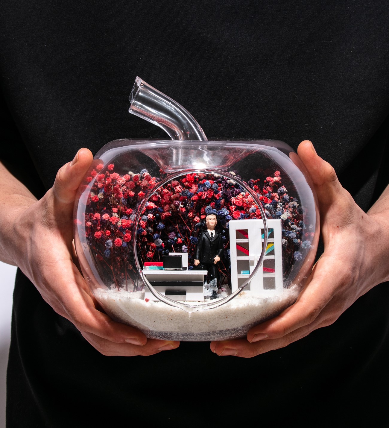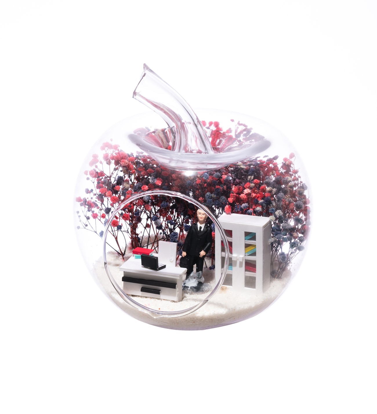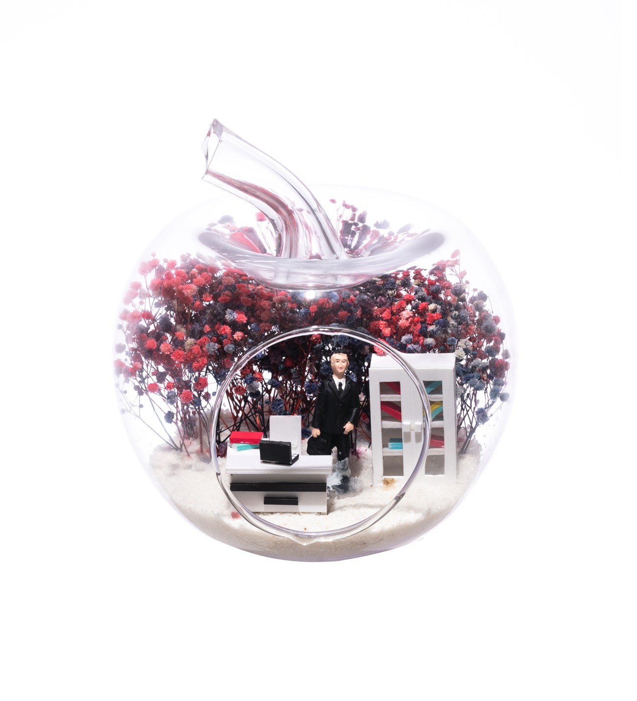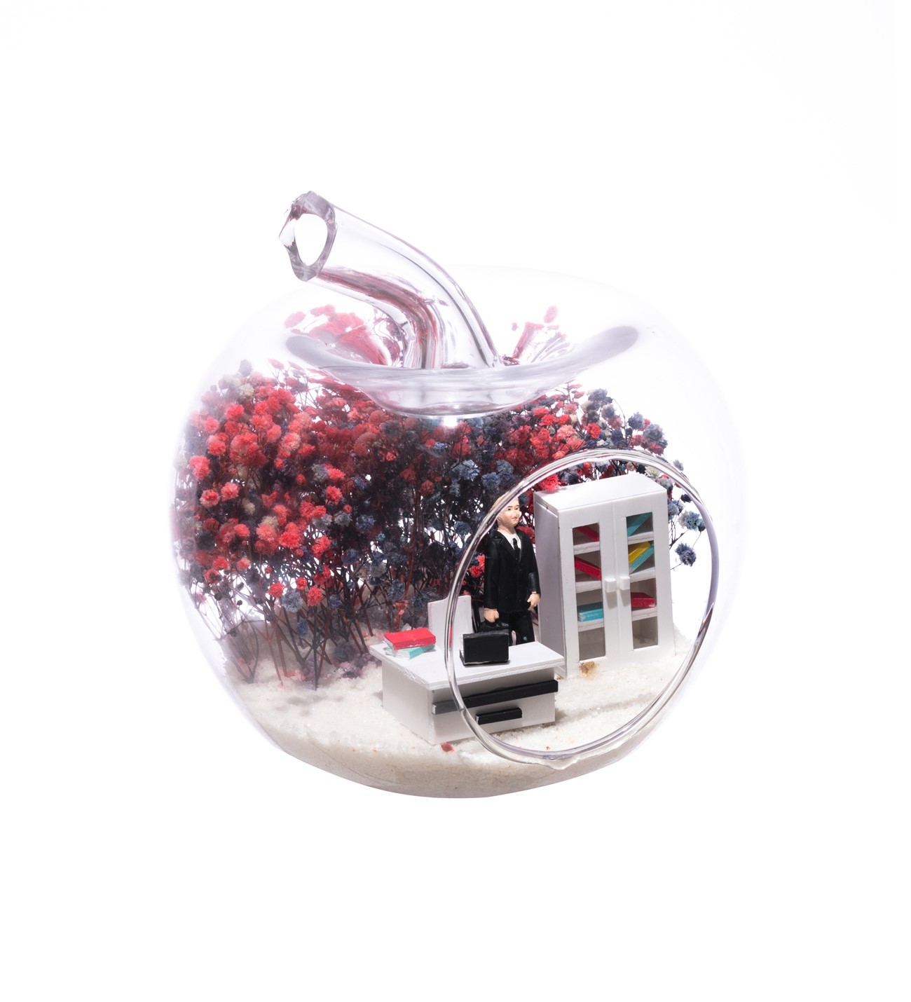 Küçük boy elma cam fanus içerisinde tasarladığımız bu çok güzel teraryum; beyaz kum, karışık renkli kurutulmuş bitkiler, bir adet ofis dolabı, bir adet üzerinde bilgisayarı ve sandalyesinin yanında siyah takım elbisesiyle erkek çalışanı ve ofis masası görseli kullanılarak tamamlanmıştır. Ev ve ofis ortamlarının tamamında sergilenebilir teraryumun içinde, kurutulmuş bitkiler bulunduğundan hava alması önemlidir. Açık olan kısmının kapatılmaması veya büfe vb. kapalı alanlara konulmaması gereklidir. Özellikle her ortamda yıllarca, zevkle izlenebilecek özel bir teraryumdur. Yaklaşık Ölçüleri: 20x20cm NOT: Teraryumlarda kullanılan camlar, üfleme cam işçiliğiyle üretildiğinden bazı detaylarda farklılıklar gözlenebilir. Örneğin, sap kısmı ve ağız bitiş noktalarının her biri kendine özgüdür.