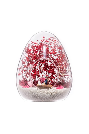 Küçük boy yumurta cam fanus içerisinde tasarladığımız, bu özgün teraryum; beyaz kum, karışık renkli kurutulmuş bitkiler, renkli simli kalpler, bir adet ofis dolabı, bir adet üzerinde bilgisayarıyla ofis masası ve sandalyesinin yanında duran, karamel elbiseli esmer iş kadını görseli kullanılarak tamamlanmıştır.. Ev ve ofis ortamlarının tamamında sergilenebilir teraryumun içinde, kurutulmuş bitkiler olduğundan hava alması önemlidir. Açık olan kısmının kapatılmaması veya büfe vb. kapalı alanlara konulmaması gereklidir. Özellikle her ortamda yıllarca, zevkle izlenebilecek özel bir teraryumdur. Yaklaşık Ölçüleri: 18x22cm NOT: Teraryumlarda kullanılan camlar, üfleme cam işçiliğiyle üretildiğinden bazı detaylarda farklılıklar gözlenebilir. Örneğin, ağız bitiş noktalarının her biri kendine özgüdür.