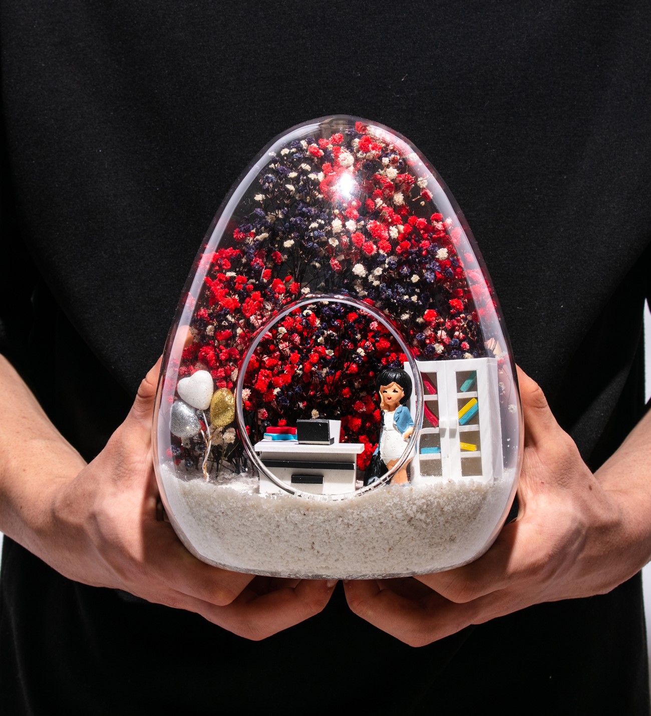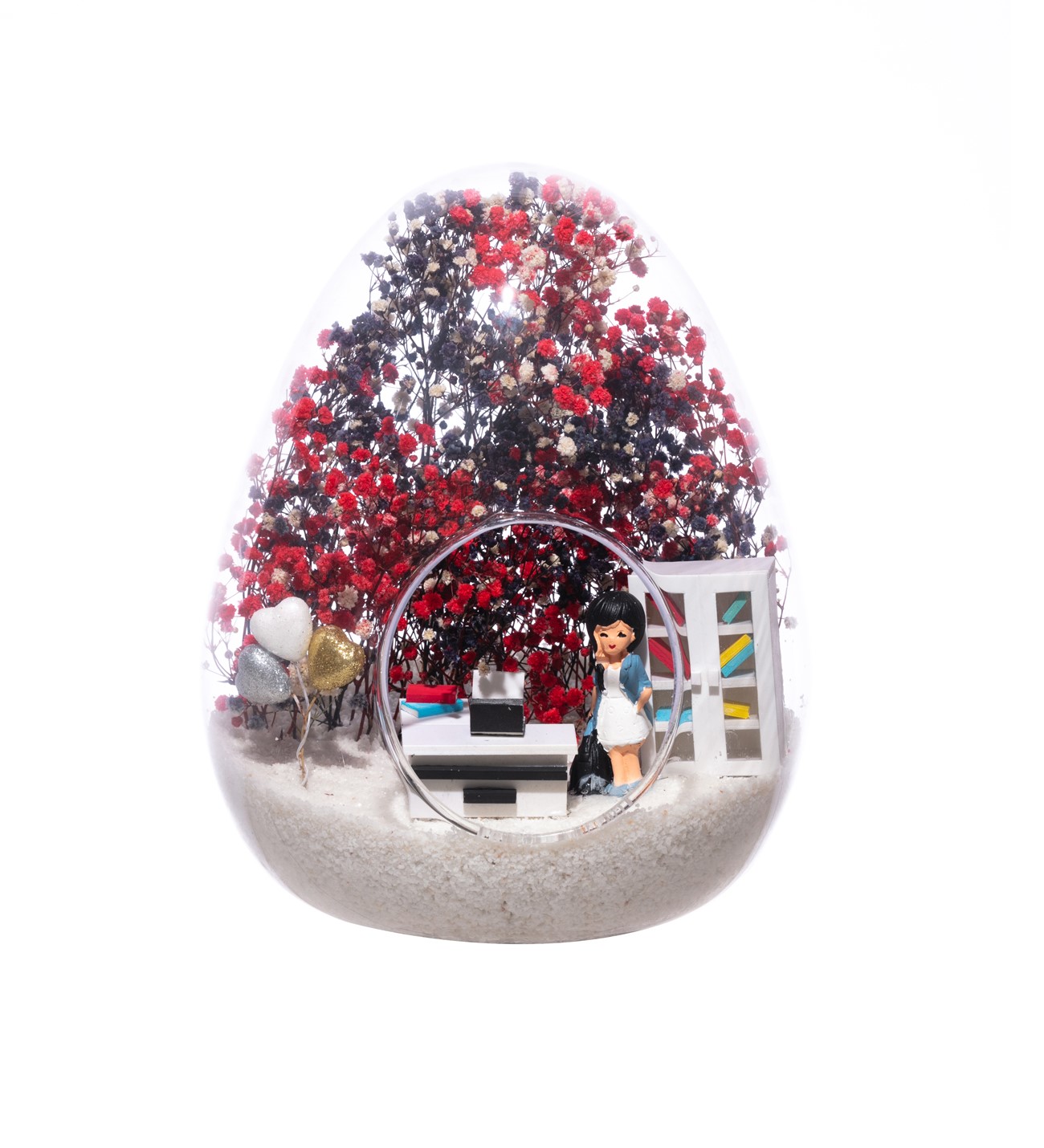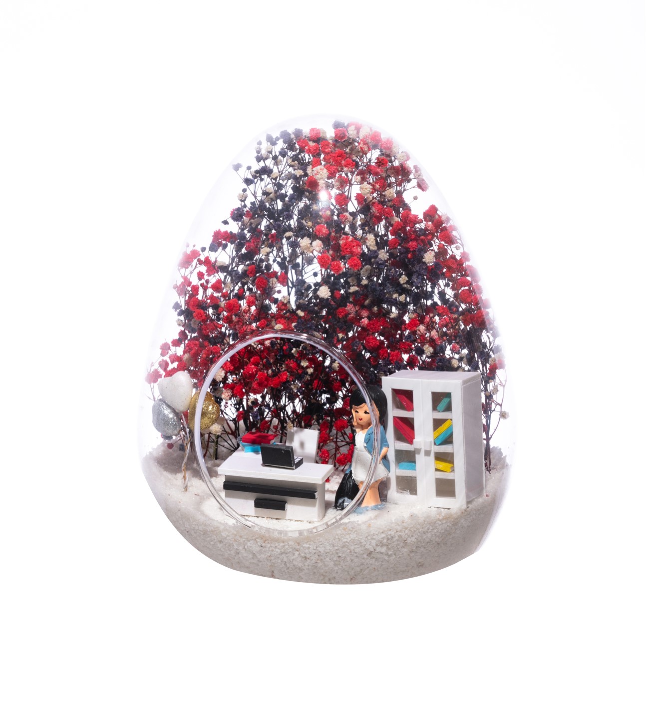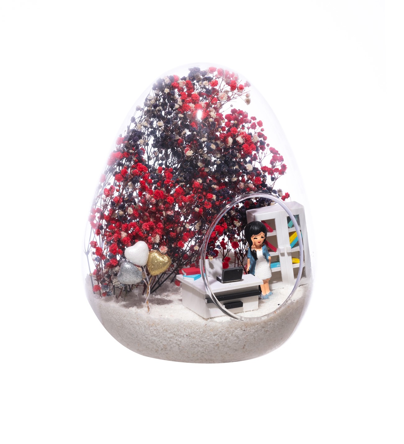 Küçük boy yumurta cam fanus içerisinde tasarladığımız, bu özgün teraryum; beyaz kum, karışık renkli kurutulmuş bitkiler, renkli simli kalpler, bir adet ofis dolabı, bir adet üzerinde bilgisayarıyla ofis masası ve sandalyesinin yanında duran, mavi elbiseli esmer iş kadını görseli kullanılarak tamamlanmıştır.. Ev ve ofis ortamlarının tamamında sergilenebilir teraryumun içinde, kurutulmuş bitkiler olduğundan hava alması önemlidir. Açık olan kısmının kapatılmaması veya büfe vb. kapalı alanlara konulmaması gereklidir. Özellikle her ortamda yıllarca, zevkle izlenebilecek özel bir teraryumdur. Yaklaşık Ölçüleri: 18x22cm NOT: Teraryumlarda kullanılan camlar, üfleme cam işçiliğiyle üretildiğinden bazı detaylarda farklılıklar gözlenebilir. Örneğin, ağız bitiş noktalarının her biri kendine özgüdür.