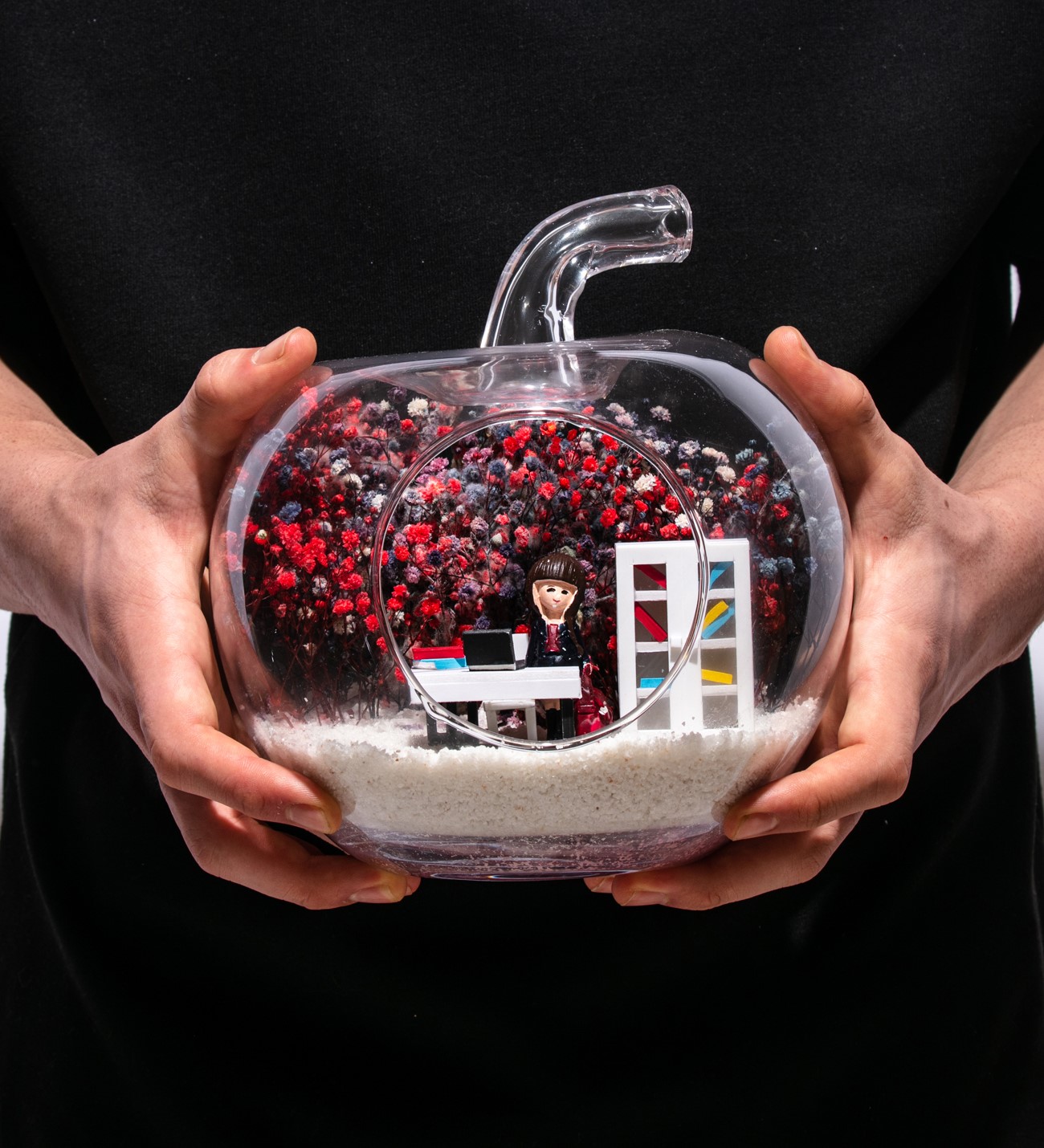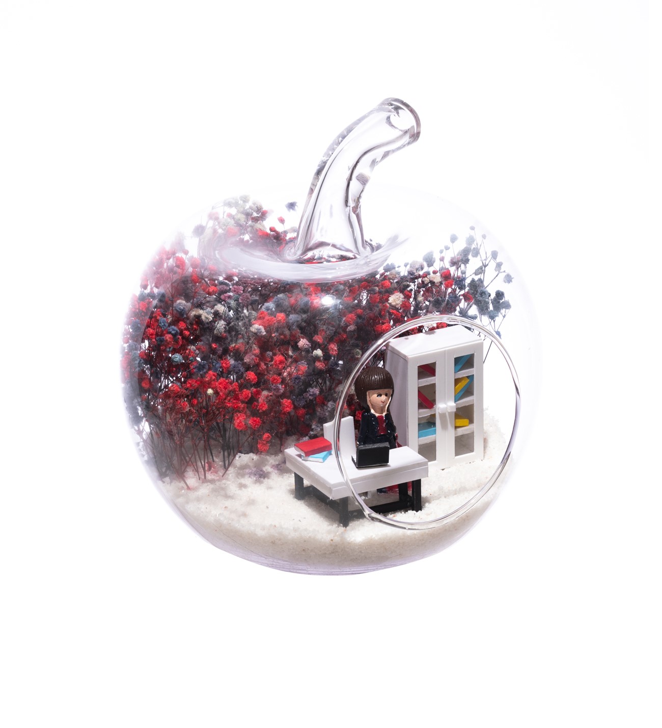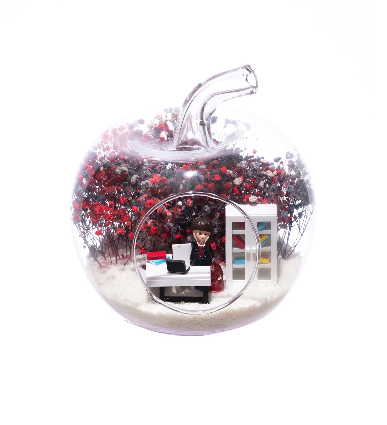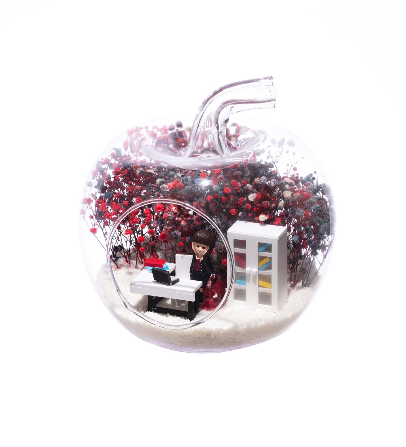 Küçük boy elma cam fanus içerisinde tasarladığımız bu çok güzel teraryum; beyaz kum, karışık renkli kurutulmuş bitkiler, bir adet ofis dolabı, bir adet üzerinde bilgisayarı ve sandalyesinin yanında duran kumral iş kadını ve ofis masası görseli kullanılarak tamamlanmıştır. Ev ve ofis ortamlarının tamamında sergilenebilir teraryumun içinde, kurutulmuş bitkiler bulunduğundan hava alması önemlidir. Açık olan kısmının kapatılmaması veya büfe vb. kapalı alanlara konulmaması gereklidir. Özellikle her ortamda yıllarca, zevkle izlenebilecek özel bir teraryumdur. Yaklaşık Ölçüleri: 20x20cm NOT: Teraryumlarda kullanılan camlar, üfleme cam işçiliğiyle üretildiğinden bazı detaylarda farklılıklar gözlenebilir. Örneğin, sap kısmı ve ağız bitiş noktalarının her biri kendine özgüdür.