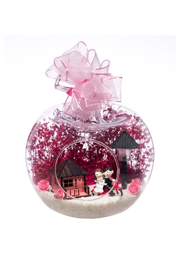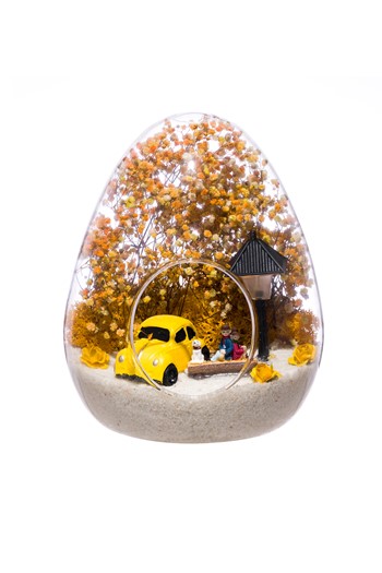 Küçük boy yumurta cam fanus içerisinde tasarladığımız, bu özgün teraryum; beyaz kum, karışık renkli kurutulmuş bitkiler, renkli simli kalpler, bir adet ofis dolabı, bir adet üzerinde bilgisayarıyla ofis masası ve sandalyesinin yanında duran, mavi elbiseli sarışın iş kadını görseli kullanılarak tamamlanmıştır.. Ev ve ofis ortamlarının tamamında sergilenebilir teraryumun içinde, kurutulmuş bitkiler olduğundan hava alması önemlidir. Açık olan kısmının kapatılmaması veya büfe vb. kapalı alanlara konulmaması gereklidir. Özellikle her ortamda yıllarca, zevkle izlenebilecek özel bir teraryumdur. Yaklaşık Ölçüleri: 18x22cm NOT: Teraryumlarda kullanılan camlar, üfleme cam işçiliğiyle üretildiğinden bazı detaylarda farklılıklar gözlenebilir. Örneğin, ağız bitiş noktalarının her biri kendine özgüdür.