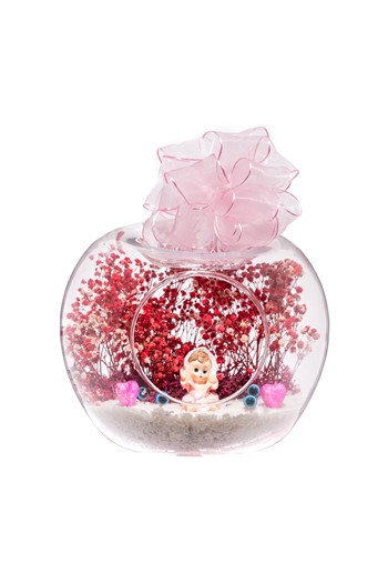 Küçük boy elma cam fanus içerisinde tasarladığımız bu teraryum; beyaz kum, şoklanmış yosunlar, kurutulmuş bitkiler, bir adet ahşap beyaz ev, çiftlik hayvanlarını simgeleyen objeler ve bahçelerindeki bankta köpekleriyle oturmuş sohbet eden aşıkları simgeleyen objelerle tamamlanmıştır. Ev ve ofis ortamlarının tamamında sergilenebilir teraryumun içinde, kurutulmuş ve şoklanmış bitkiler bulunduğundan hava alması önemlidir. Açık olan kısmının kapatılmaması veya büfe vb. kapalı alanlara konulmaması gereklidir. Özellikle her ortamda yıllarca, zevkle izlenebilecek özel bir teraryumdur. Yaklaşık Ölçüleri: 20x20cm NOT: Teraryumlarda kullanılan camlar, üfleme cam işçiliğiyle üretildiğinden bazı detaylarda farklılıklar gözlenebilir. Örneğin, sap kısmı ve ağız bitiş noktalarının her biri kendine özgüdür.