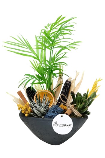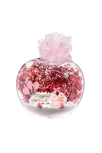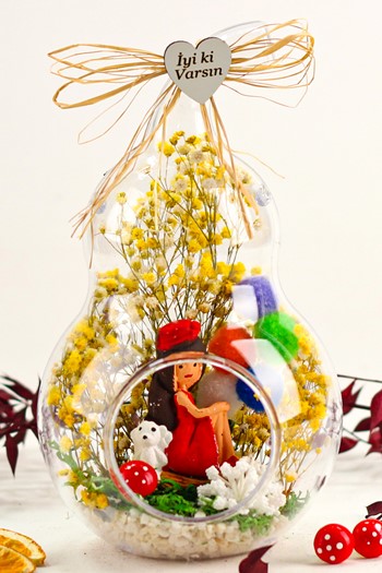 Kurdele takılmış küçük boy elma cam fanus içerisinde tasarladığımız bu anlamlı teraryum; beyaz kum, kurutulmuş bitkiler, şoklanmış yosunlar, bir adet ahşap beyaz ev, bir adet ahşap oymalı bahçe masası ve iki adet ahşap oymalı bahçe sandalyeleri objeler kullanılarak tamamlanmıştır. Ev ve ofis ortamlarının tamamında sergilenebilir teraryumun içinde, kurutulmuş ve şoklanmış bitkiler bulunduğundan hava alması önemlidir. Açık olan kısmının kapatılmaması veya büfe vb. kapalı alanlara konulmaması gereklidir. Özellikle her ortamda yıllarca, zevkle izlenebilecek özel bir teraryumdur. Yaklaşık Ölçüleri: 20x20cm NOT: Teraryumlarda kullanılan camlar, üfleme cam işçiliğiyle üretildiğinden bazı detaylarda farklılıklar gözlenebilir. Örneğin, sap kısmı ve ağız bitiş noktalarının her biri kendine özgüdür.