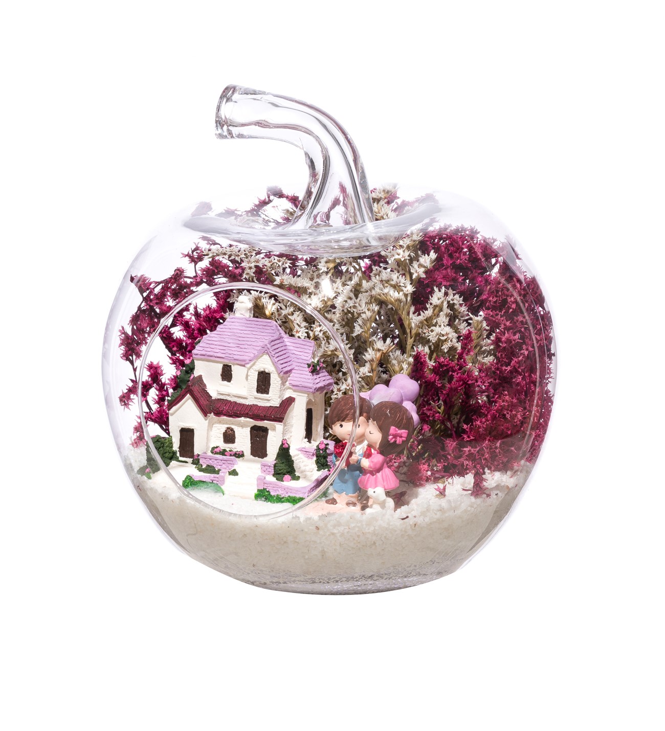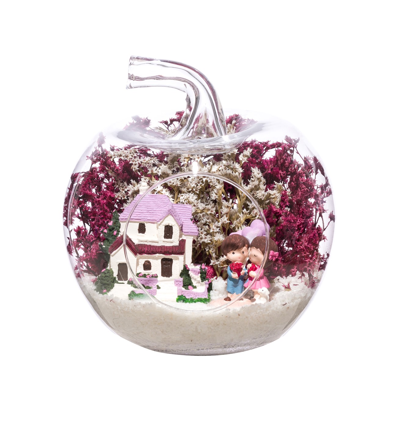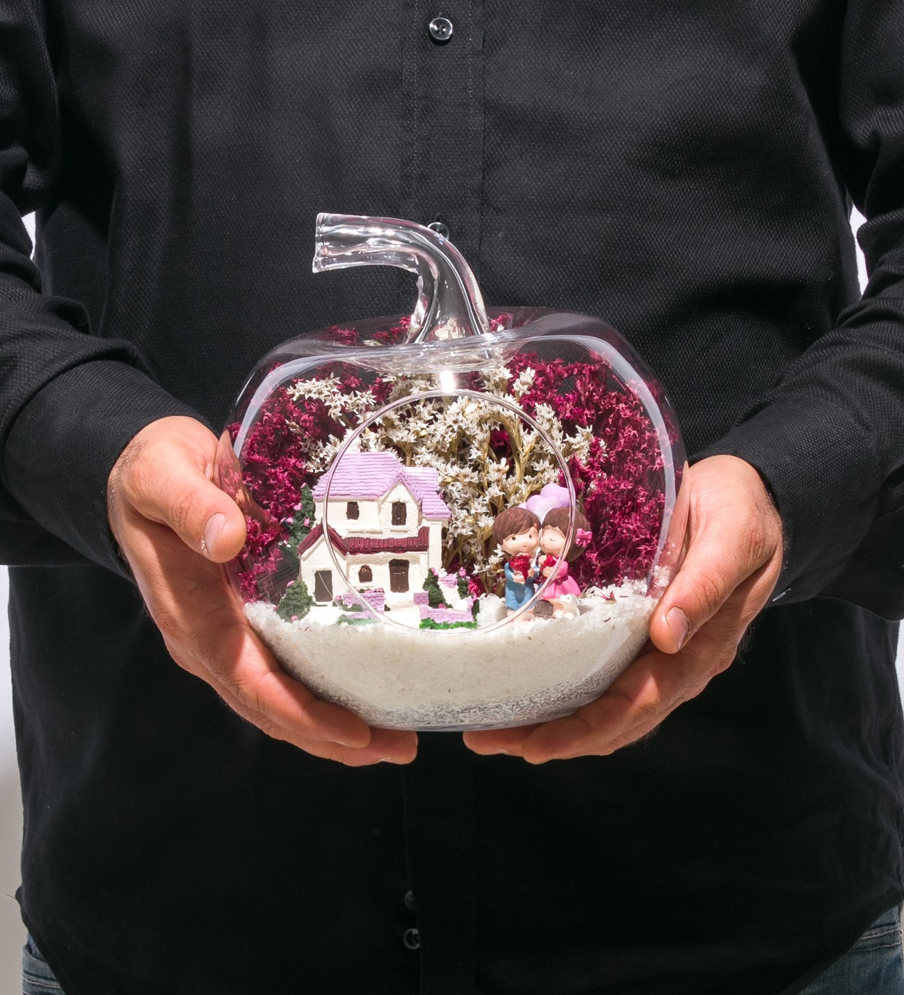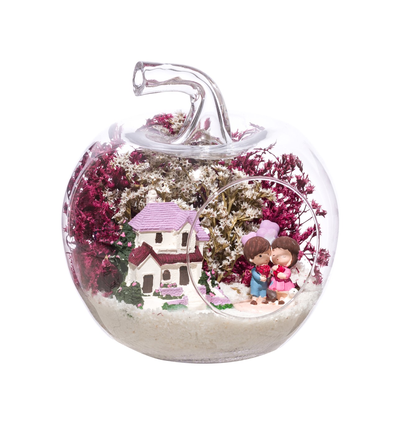 Küçük boy elma cam fanus içerisinde tasarladığımız bu anlamlı teraryum; beyaz kum, şoklanmış yosunlar, kurutulmuş bitkiler, bir adet kır evi ve kol kola sohbet eden sevgilileri simgeleyen objeler kullanılarak tamamlanmıştır. Ev ve ofis ortamlarının tamamında sergilenebilir teraryumun içinde, kurutulmuş ve şoklanmış bitkiler bulunduğundan hava alması önemlidir. Açık olan kısmının kapatılmaması veya büfe vb. kapalı alanlara konulmaması gereklidir. Özellikle her ortamda yıllarca, zevkle izlenebilecek özel bir teraryumdur. Yaklaşık Ölçüleri: 20x20cm NOT: Teraryumlarda kullanılan camlar, üfleme cam işçiliğiyle üretildiğinden bazı detaylarda farklılıklar gözlenebilir. Örneğin, sap kısmı ve ağız bitiş noktalarının her biri kendine özgüdür.