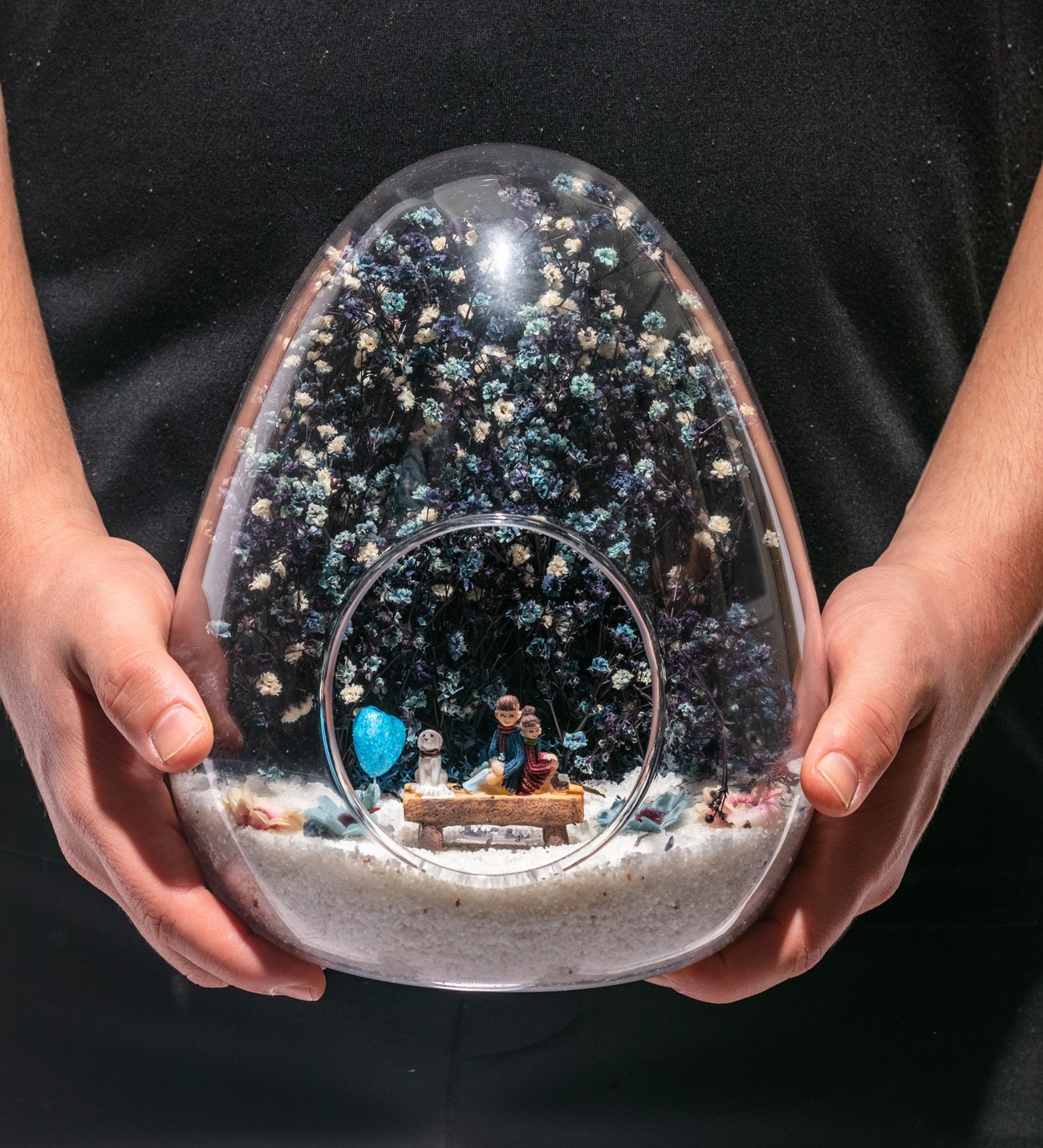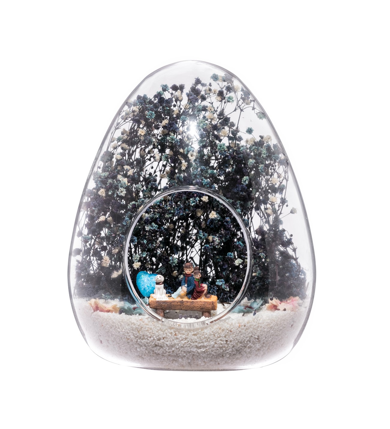Küçük boy yumurta cam fanus içerisinde tasarladığımız bu özgün teraryum; beyaz kum, kurutulmuş bitkiler, şoklanmış yosunlar, bir adet simli kalp, renkli yapay mini çiçekler ve bankta sırt sırta oturan sevgilileri simgeleyen obje kullanılarak tamamlanmıştır. Ev ve ofis ortamlarının tamamında sergilenebilir teraryumun içinde, kurutulmuş bitkiler olduğundan hava alması önemlidir. Açık olan kısmının kapatılmaması veya büfe vb. kapalı alanlara konulmaması gereklidir. Özellikle her ortamda, zevkle izlenebilecek özel bir teraryumdur. Yaklaşık Ölçüleri: 18x22cm NOT: Teraryumlarda kullanılan camlar, üfleme cam işçiliğiyle üretildiğinden bazı detaylarda farklılıklar gözlenebilir. Örneğin, ağız bitiş noktalarının her biri kendine özgüdür.