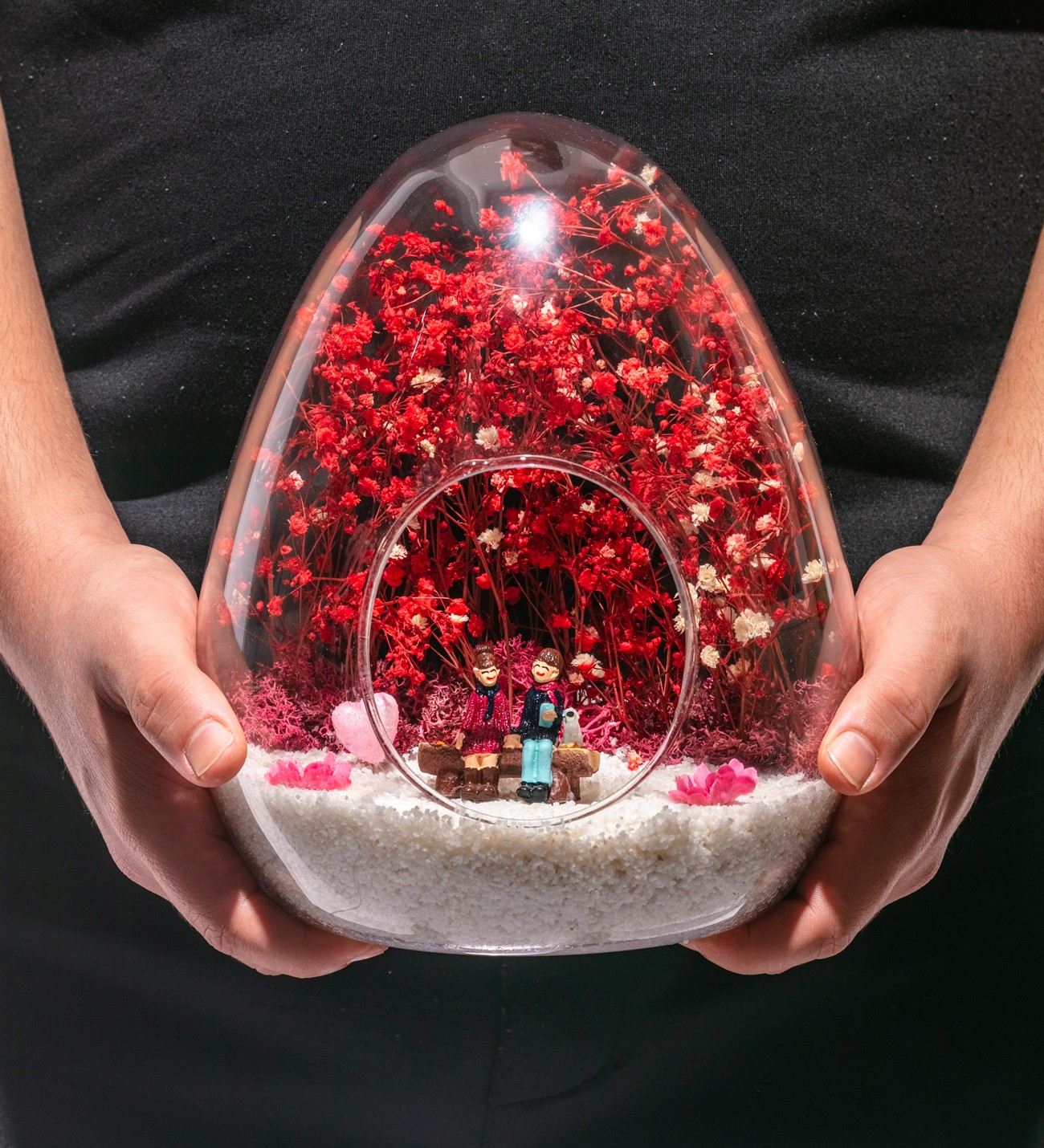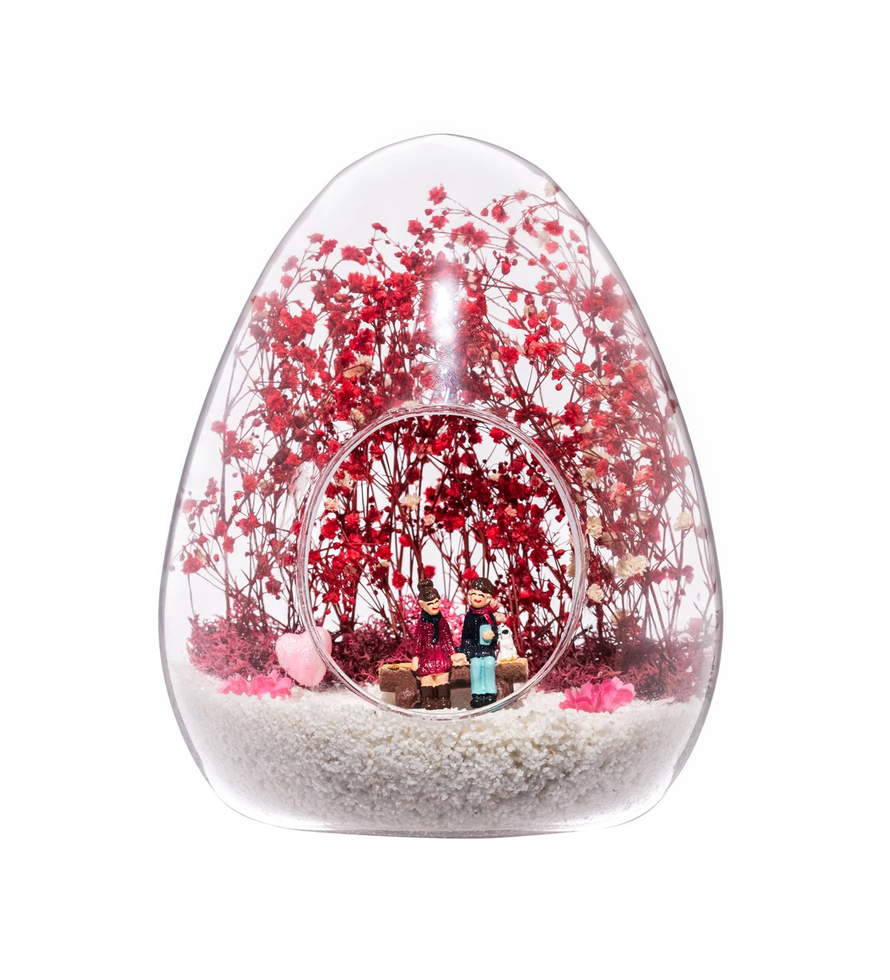 Küçük boy yumurta cam fanus içerisinde tasarladığımız bu özgün teraryum; beyaz kum, kurutulmuş bitkiler, şoklanmış yosunlar, bir adet simli kalp, renkli yapay mini çiçekler ve bankta yan yana oturan sevgilileri simgeleyen obje kullanılarak tamamlanmıştır. Ev ve ofis ortamlarının tamamında sergilenebilir teraryumun içinde, kurutulmuş bitkiler olduğundan hava alması önemlidir. Açık olan kısmının kapatılmaması veya büfe vb. kapalı alanlara konulmaması gereklidir. Özellikle her ortamda, zevkle izlenebilecek özel bir teraryumdur. Yaklaşık Ölçüleri: 18x22cm NOT: Teraryumlarda kullanılan camlar, üfleme cam işçiliğiyle üretildiğinden bazı detaylarda farklılıklar gözlenebilir. Örneğin, ağız bitiş noktalarının her biri kendine özgüdür.