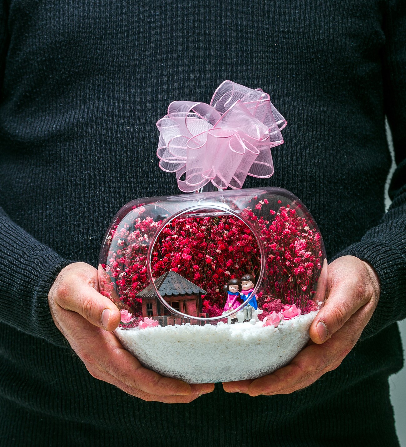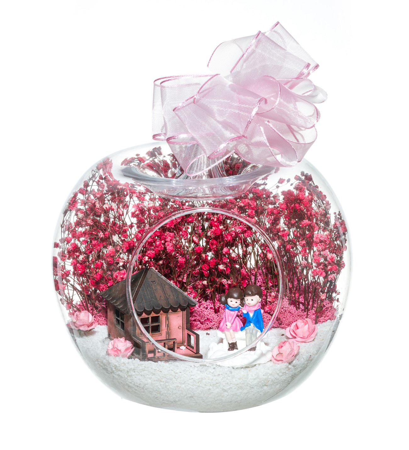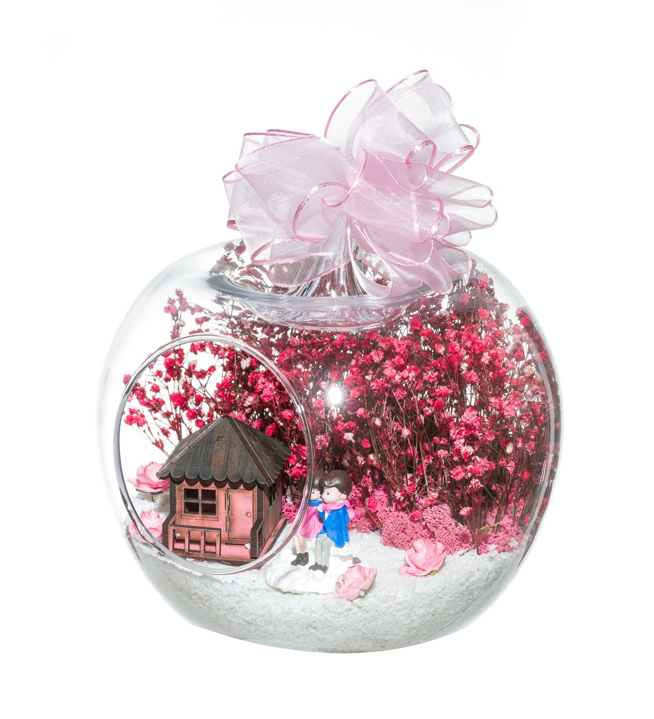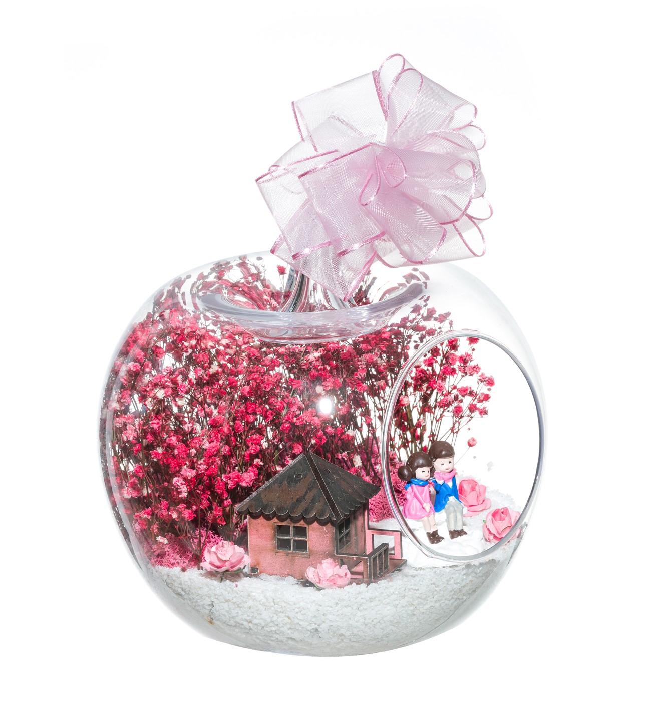 Kurdele takılı küçük boy elma cam fanus içerisinde tasarladığımız bu çok güzel teraryum; beyaz kum, şoklanmış yosunlar, kurutulmuş bitkiler, mini yapay güller, bir adet ahşap pembe ev ve bahçelerinde yan yana oturmuş sevgilerini bir birine aktaran aşıkları simgeleyen objelerle tamamlanmıştır. Ev ve ofis ortamlarının tamamında sergilenebilir teraryumun içinde, kurutulmuş ve şoklanmış bitkiler bulunduğundan hava alması önemlidir. Açık olan kısmının kapatılmaması veya büfe vb. kapalı alanlara konulmaması gereklidir. Özellikle her ortamda yıllarca, zevkle izlenebilecek özel bir teraryumdur. Yaklaşık Ölçüleri: 20x20cm NOT: Teraryumlarda kullanılan camlar, üfleme cam işçiliğiyle üretildiğinden bazı detaylarda farklılıklar gözlenebilir. Örneğin, sap kısmı ve ağız bitiş noktalarının her biri kendine özgüdür.