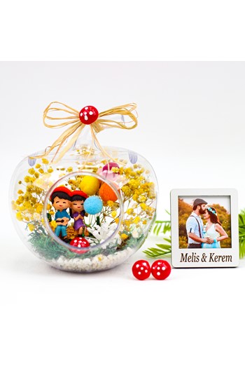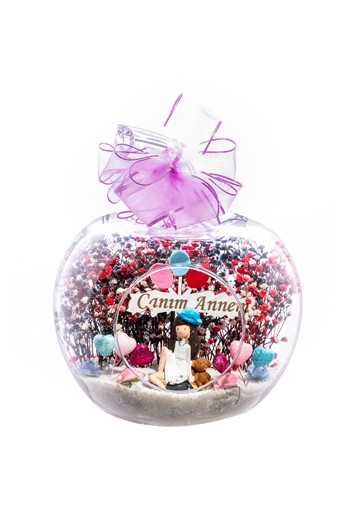 Küçük boy elma cam fanus içerisinde tasarladığımız bu kurdeleli güzel teraryum; beyaz kum, kurutulmuş bitkiler, şoklanmış yosunlar, yapay mini güller, bir adet ahşap annemin bahçesi yazılı balonlu tabela, bir adet pembe ahşap ev ve bir adet bankta sırt sırta oturan çifti simgeleyen objeler kullanılarak tamamlanmıştır. Ev ve ofis ortamlarının tamamında sergilenebilir teraryumun içinde, kurutulmuş bitkiler bulunduğundan hava alması önemlidir. Açık olan kısmının kapatılmaması veya büfe vb. kapalı alanlara konulmaması gereklidir. Özellikle her ortamda yıllarca, zevkle izlenebilecek özel bir teraryumdur. Yaklaşık Ölçüleri: 20x20cm NOT: Teraryumlarda kullanılan camlar, üfleme cam işçiliğiyle üretildiğinden bazı detaylarda farklılıklar gözlenebilir. Örneğin, sap kısmı ve ağız bitiş noktalarının her biri kendine özgüdür.