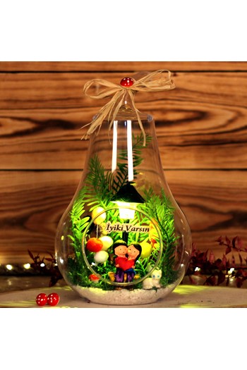Küçük boy elma cam fanus içerisinde tasarladığımız bu çok güzel teraryum; beyaz kum, karışık renkli kurutulmuş bitkiler, renkli yapay mini güller, renkli simli kalpler, bir adet ahşap ev ve bankta sırt sırta oturmuş, anı paylaşan aşıkları simgeleyen objeler kullanılarak tamamlanmıştır. Ev ve ofis ortamlarının tamamında sergilenebilir teraryumun içinde, kurutulmuş bitkiler bulunduğundan hava alması önemlidir. Açık olan kısmının kapatılmaması veya büfe vb. kapalı alanlara konulmaması gereklidir. Özellikle her ortamda yıllarca, zevkle izlenebilecek özel bir teraryumdur. Yaklaşık Ölçüleri: 20x20cm NOT: Teraryumlarda kullanılan camlar, üfleme cam işçiliğiyle üretildiğinden bazı detaylarda farklılıklar gözlenebilir. Örneğin, sap kısmı ve ağız bitiş noktalarının her biri kendine özgüdür.