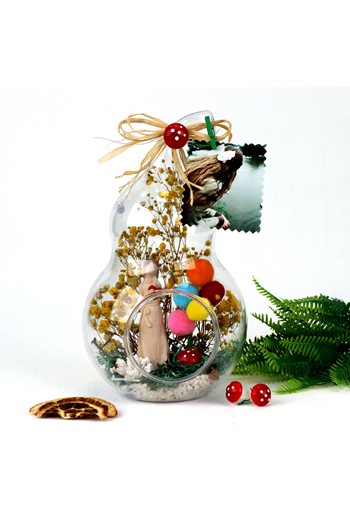 Kurdele takılı küçük boy elma cam fanus içerisinde tasarladığımız bu çok güzel teraryum; beyaz kum, şoklanmış yosunlar, kurutulmuş bitkiler, yapay güller, bir adet ışığı iki farklı renkte yanan led sokak lambası, bir adet ahşap kırmızı ev ve bankta yan yana oturmuş sevgiyle sohbet eden aşıkları simgeleyen objelerle tamamlanmıştır. Ev ve ofis ortamlarının tamamında sergilenebilir teraryumun içinde, kurutulmuş ve şoklanmış bitkiler bulunduğundan hava alması önemlidir. Açık olan kısmının kapatılmaması veya büfe vb. kapalı alanlara konulmaması gereklidir. Özellikle her ortamda yıllarca, zevkle izlenebilecek özel bir teraryumdur. Yaklaşık Ölçüleri: 20x20cm NOT: Teraryumlarda kullanılan camlar, üfleme cam işçiliğiyle üretildiğinden bazı detaylarda farklılıklar gözlenebilir. Örneğin, sap kısmı ve ağız bitiş noktalarının her biri kendine özgüdür.