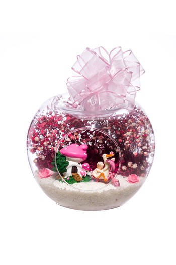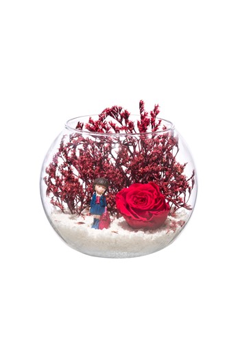 Kurdele takılı küçük boy elma cam fanus içerisinde tasarladığımız bu çok güzel teraryum; beyaz kum, şoklanmış yosunlar, kurutulmuş bitkiler, yapay güller, bir adet ışığı iki farklı renkte yanan led sokak lambası, bir adet ahşap beyaz ev ve bankta yan yana oturmuş sevgiyle sohbet eden aşıkları simgeleyen objelerle tamamlanmıştır. Ev ve ofis ortamlarının tamamında sergilenebilir teraryumun içinde, kurutulmuş ve şoklanmış bitkiler bulunduğundan hava alması önemlidir. Açık olan kısmının kapatılmaması veya büfe vb. kapalı alanlara konulmaması gereklidir. Özellikle her ortamda yıllarca, zevkle izlenebilecek özel bir teraryumdur. Yaklaşık Ölçüleri: 20x20cm NOT: Teraryumlarda kullanılan camlar, üfleme cam işçiliğiyle üretildiğinden bazı detaylarda farklılıklar gözlenebilir. Örneğin, sap kısmı ve ağız bitiş noktalarının her biri kendine özgüdür.
