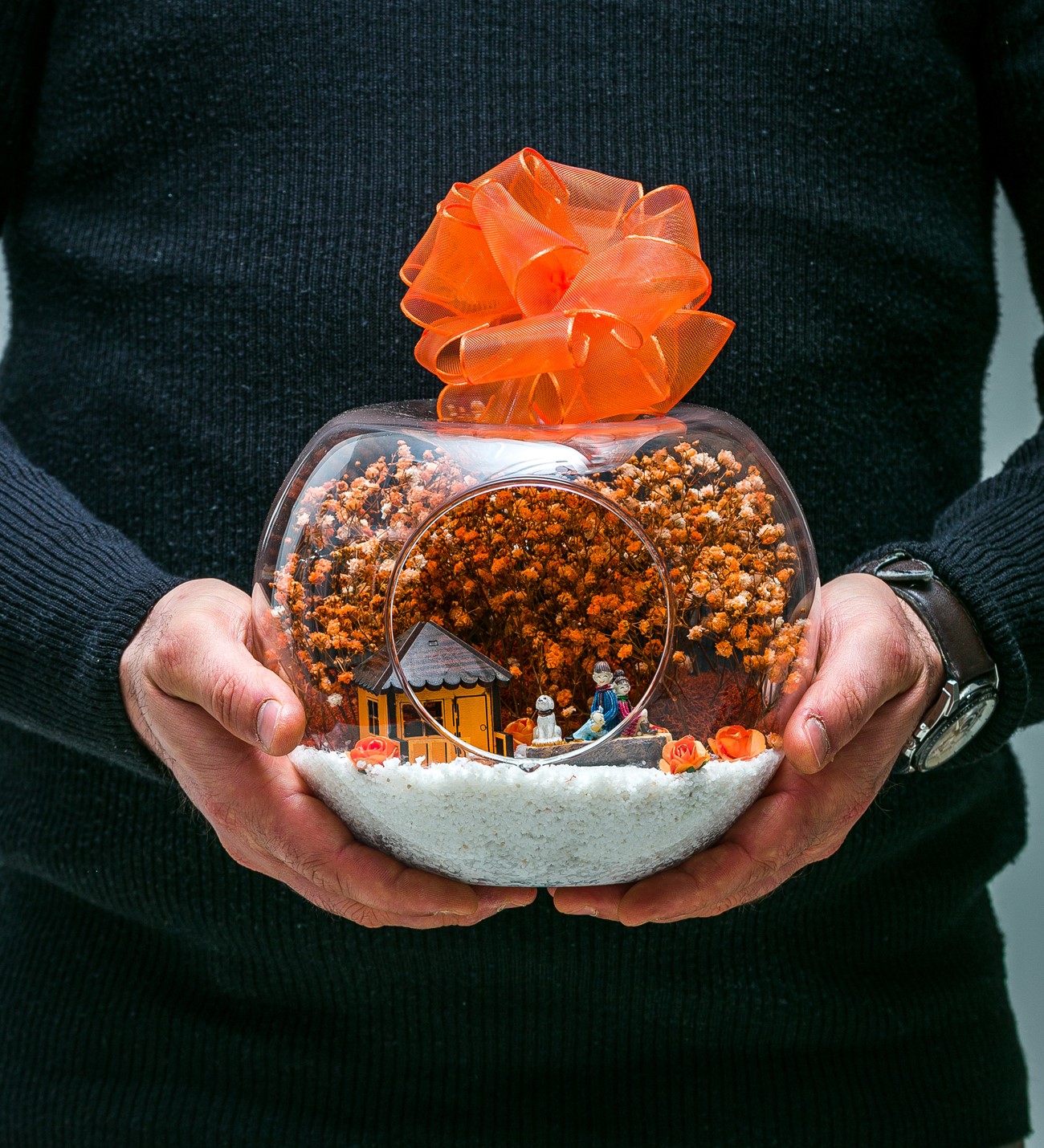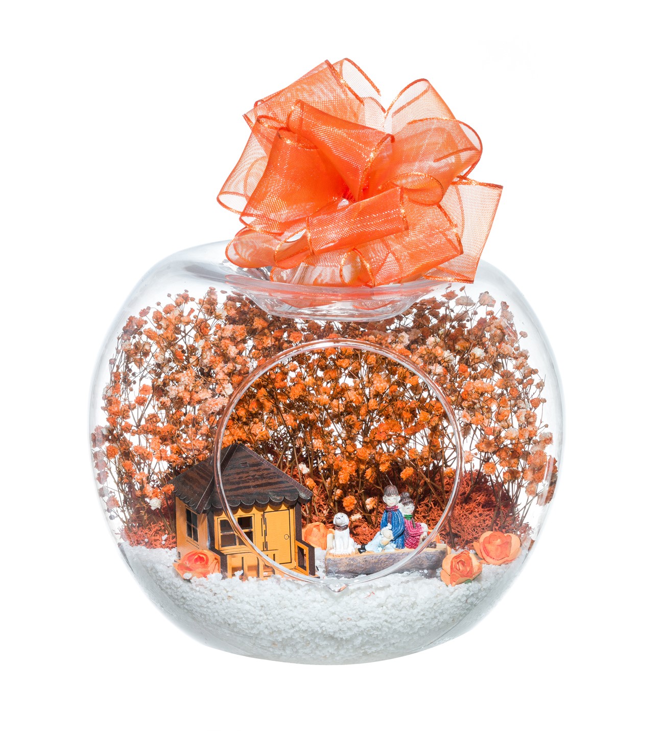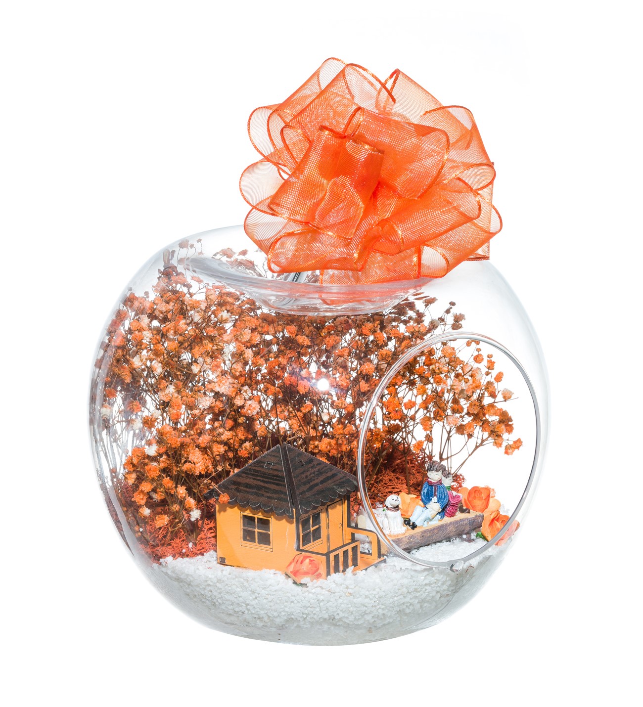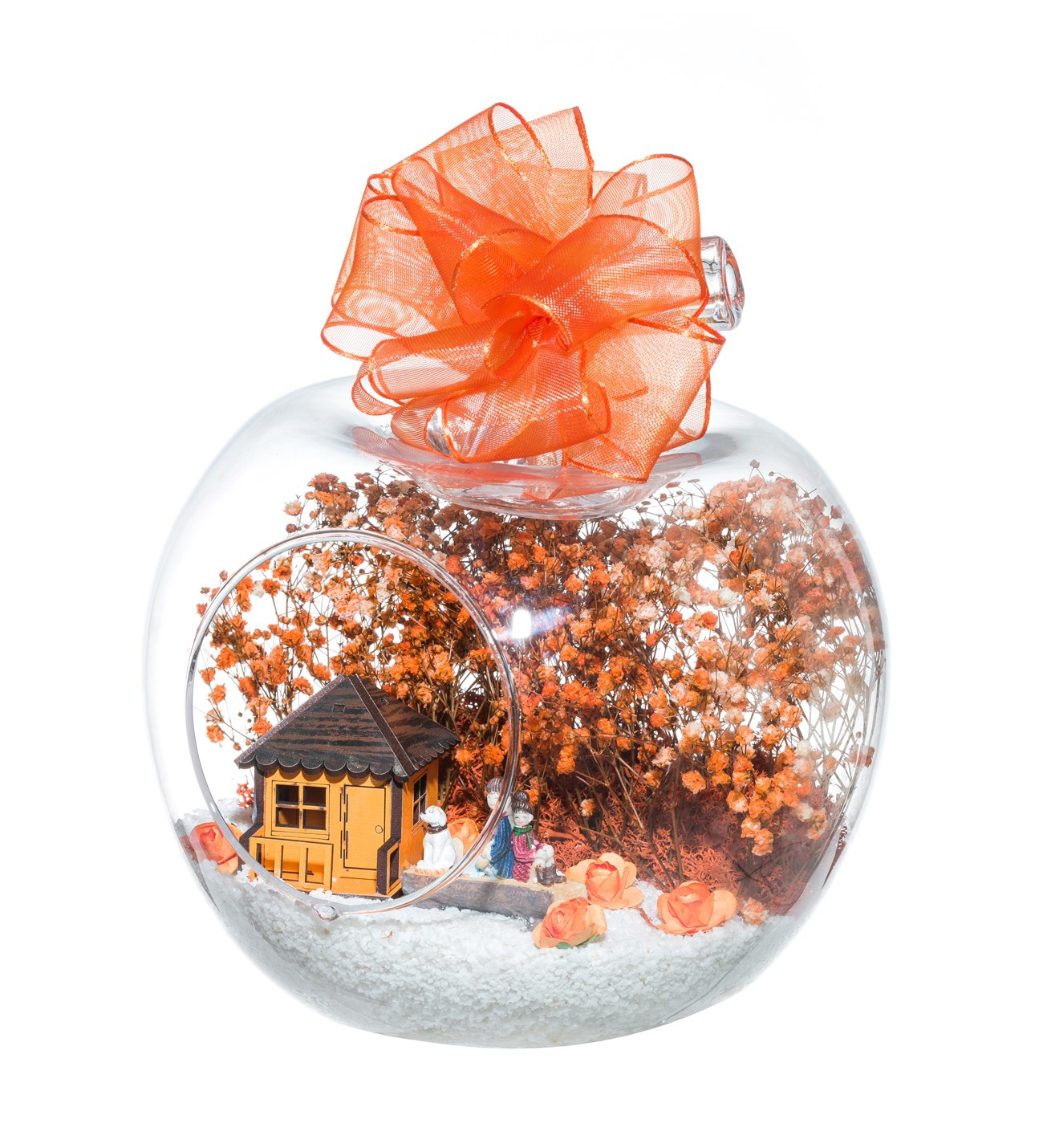 Kurdele takılı küçük boy elma cam fanus içerisinde tasarladığımız bu çok güzel teraryum; beyaz kum, şoklanmış yosunlar, kurutulmuş bitkiler, mini yapay güller, bir adet ahşap turuncu ev ve bahçelerinde yanlarında köpekleriyle, bankta bir birine yaslanmış anı paylaşan yetişkinleri simgeleyen objelerle tamamlanmıştır. Ev ve ofis ortamlarının tamamında sergilenebilir teraryumun içinde, kurutulmuş ve şoklanmış bitkiler bulunduğundan hava alması önemlidir. Açık olan kısmının kapatılmaması veya büfe vb. kapalı alanlara konulmaması gereklidir. Özellikle her ortamda yıllarca, zevkle izlenebilecek özel bir teraryumdur. Yaklaşık Ölçüleri: 20x20cm NOT: Teraryumlarda kullanılan camlar, üfleme cam işçiliğiyle üretildiğinden bazı detaylarda farklılıklar gözlenebilir. Örneğin, sap kısmı ve ağız bitiş noktalarının her biri kendine özgüdür.
