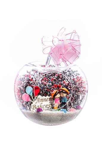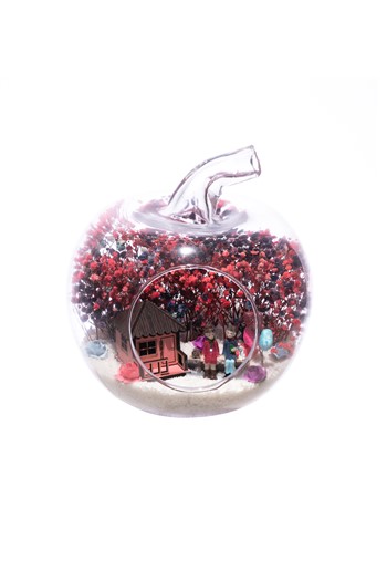 Kurdele takılı küçük boy elma cam fanus içerisinde tasarladığımız bu çok güzel teraryum; beyaz kum, şoklanmış yosunlar, kurutulmuş bitkiler, yapay güller ve yan yana oturmuş sevgiyle sohbet eden aşıkları simgeleyen obje ile tamamlanmıştır. Ev ve ofis ortamlarının tamamında sergilenebilir teraryumun içinde, kurutulmuş ve şoklanmış bitkiler bulunduğundan hava alması önemlidir. Açık olan kısmının kapatılmaması veya büfe vb. kapalı alanlara konulmaması gereklidir. Özellikle her ortamda yıllarca, zevkle izlenebilecek özel bir teraryumdur. Yaklaşık Ölçüleri: 20x20cm NOT: Teraryumlarda kullanılan camlar, üfleme cam işçiliğiyle üretildiğinden bazı detaylarda farklılıklar gözlenebilir. Örneğin, sap kısmı ve ağız bitiş noktalarının her biri kendine özgüdür.