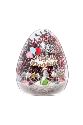 Kurdele takılı küçük boy elma cam fanus içerisinde tasarladığımız bu çok güzel teraryum; beyaz kum, şoklanmış yosunlar, kurutulmuş bitkiler ve yanında sevdiği kıza aşkını pembe güllerle anlatan aşıkları simgeleyen obje ile tamamlanmıştır. Ev ve ofis ortamlarının tamamında sergilenebilir teraryumun içinde, kurutulmuş ve şoklanmış bitkiler bulunduğundan hava alması önemlidir. Açık olan kısmının kapatılmaması veya büfe vb. kapalı alanlara konulmaması gereklidir. Özellikle her ortamda yıllarca, zevkle izlenebilecek özel bir teraryumdur. Yaklaşık Ölçüleri: 20x20cm NOT: Teraryumlarda kullanılan camlar, üfleme cam işçiliğiyle üretildiğinden bazı detaylarda farklılıklar gözlenebilir. Örneğin, sap kısmı ve ağız bitiş noktalarının her biri kendine özgüdür.