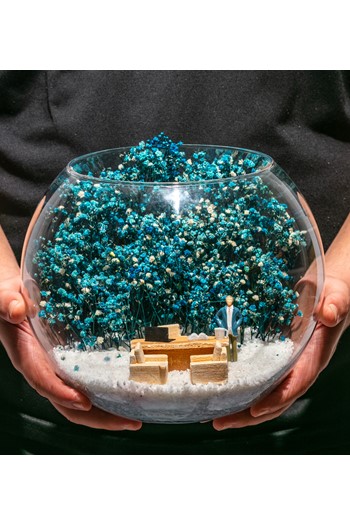 Küçük boy elma cam fanus içerisinde tasarladığımız bu çok güzel teraryum; beyaz kum, karışık renkli kurutulmuş bitkiler, renkli mini yapay güller, renkli simli kalpler ve bir adet sarışın genç kızı simgeleyen objeler kullanılarak tamamlanmıştır. Ev ve ofis ortamlarının tamamında sergilenebilir teraryumun içinde, kurutulmuş bitkiler bulunduğundan hava alması önemlidir. Açık olan kısmının kapatılmaması veya büfe vb. kapalı alanlara konulmaması gereklidir. Özellikle her ortamda yıllarca, zevkle izlenebilecek özel bir teraryumdur. Yaklaşık Ölçüleri: 20x20cm NOT: Teraryumlarda kullanılan camlar, üfleme cam işçiliğiyle üretildiğinden bazı detaylarda farklılıklar gözlenebilir. Örneğin, sap kısmı ve ağız bitiş noktalarının her biri kendine özgüdür.