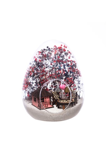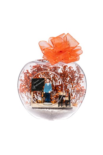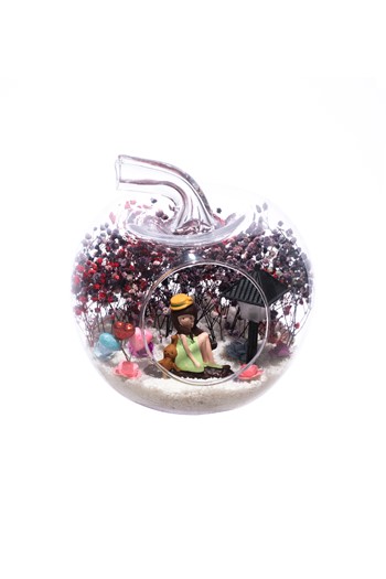 Küçük boy elma cam fanus içerisinde tasarladığımız bu kurdeleli teraryum, sevgili öğretmenlerimizi, gördükleri anda mutlu edecek şekilde tasarlandı. Tasarımımız; beyaz kum, kurutulmuş bitkilerle beraber bir adet CANIM ÖĞRETMENİM yazılı kara tahtalı sınıf görseli ve bir adet bayan objeyle tamamlanmıştır. Ev ve ofis ortamlarının tamamında sergilenebilir teraryumun içinde, kurutulmuş bitkiler bulunduğundan hava alması önemlidir. Açık olan kısmının kapatılmaması veya büfe vb. kapalı alanlara konulmaması gereklidir. Özellikle her ortamda, zevkle izlenebilecek çok özel bir teraryumdur. Yaklaşık Ölçüleri: 20x20cm NOT: Teraryumlarda kullanılan camlar, üfleme cam işçiliğiyle üretildiğinden bazı detaylarda farklılıklar gözlenebilir. Örneğin, sap kısmı ve ağız bitiş noktalarının her biri kendine özgüdür.