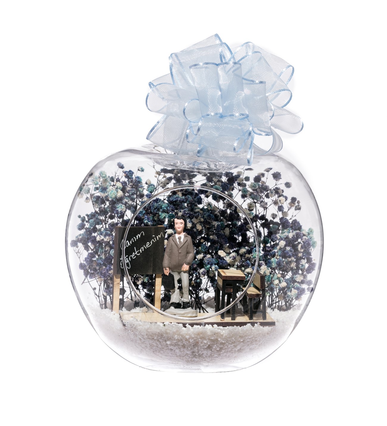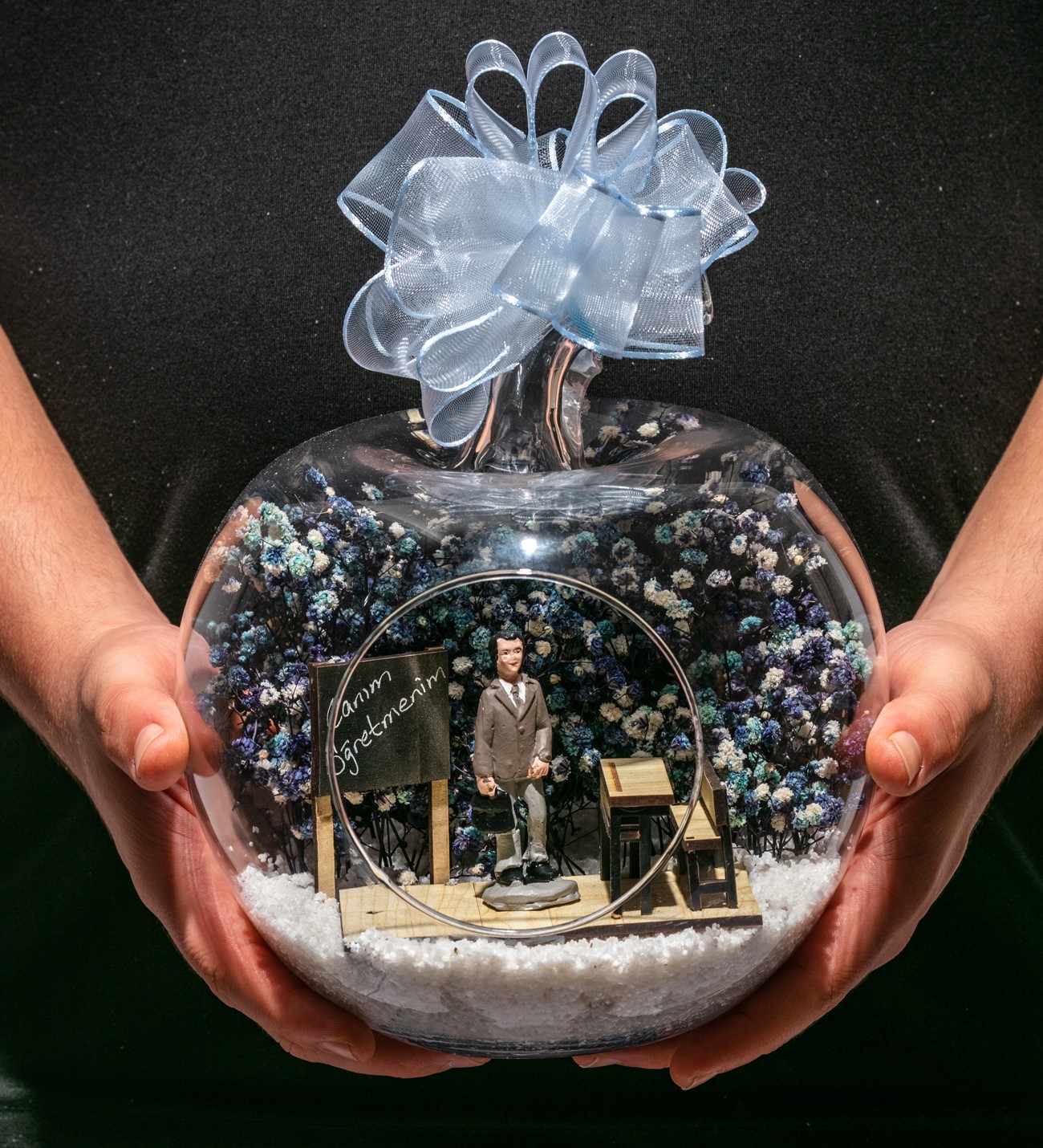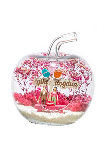 Küçük boy elma cam fanus içerisinde tasarladığımız bu kurdeleli teraryum, sevgili öğretmenlerimizi, gördükleri anda mutlu edecek şekilde tasarlandı. Tasarımımız; beyaz kum, kurutulmuş bitkilerle beraber bir adet CANIM ÖĞRETMENİM yazılı kara tahtalı sınıf görseli ve bir adet erkek objeyle tamamlanmıştır. Ev ve ofis ortamlarının tamamında sergilenebilir teraryumun içinde, kurutulmuş bitkiler bulunduğundan hava alması önemlidir. Açık olan kısmının kapatılmaması veya büfe vb. kapalı alanlara konulmaması gereklidir. Özellikle her ortamda, zevkle izlenebilecek çok özel bir teraryumdur. Yaklaşık Ölçüleri: 20x20cm NOT: Teraryumlarda kullanılan camlar, üfleme cam işçiliğiyle üretildiğinden bazı detaylarda farklılıklar gözlenebilir. Örneğin, sap kısmı ve ağız bitiş noktalarının her biri kendine özgüdür.