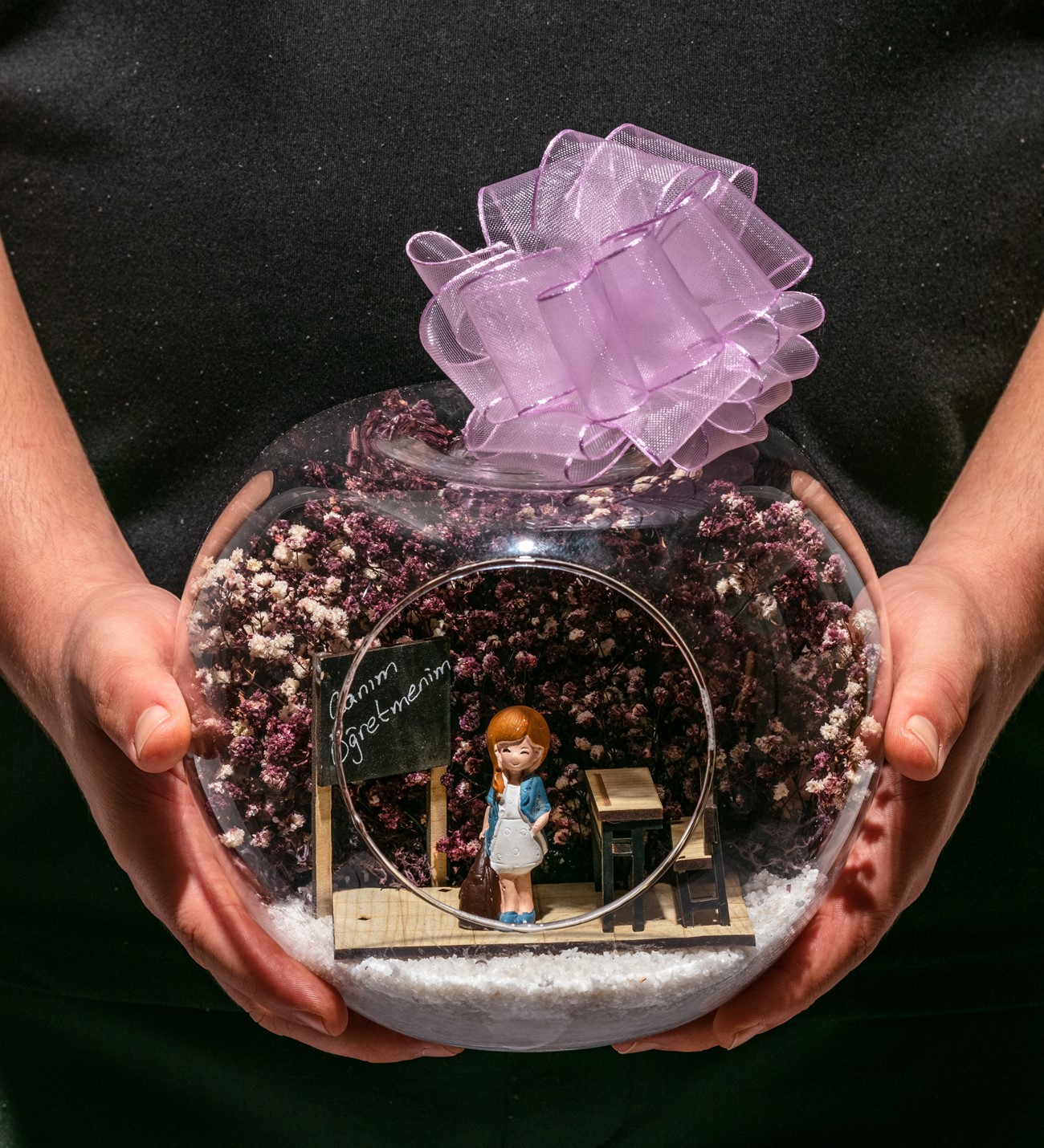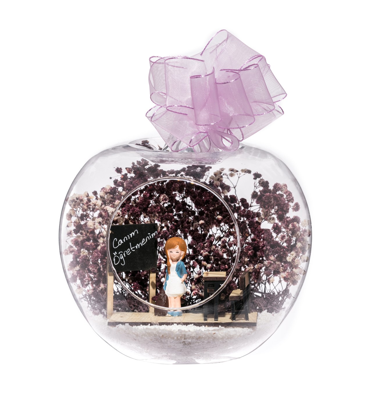 Küçük boy elma cam fanus içerisinde tasarladığımız bu kurdeleli teraryum, sevgili öğretmenlerimizi, gördükleri anda mutlu edecek şekilde tasarlandı. Tasarımımız; beyaz kum, kurutulmuş bitkilerle beraber bir adet CANIM ÖĞRETMENİM yazılı kara tahtalı sınıf görseli ve bir adet bayan objeyle tamamlanmıştır. Ev ve ofis ortamlarının tamamında sergilenebilir teraryumun içinde, kurutulmuş bitkiler bulunduğundan hava alması önemlidir. Açık olan kısmının kapatılmaması veya büfe vb. kapalı alanlara konulmaması gereklidir. Özellikle her ortamda, zevkle izlenebilecek çok özel bir teraryumdur. Yaklaşık Ölçüleri: 20x20cm NOT: Teraryumlarda kullanılan camlar, üfleme cam işçiliğiyle üretildiğinden bazı detaylarda farklılıklar gözlenebilir. Örneğin, sap kısmı ve ağız bitiş noktalarının her biri kendine özgüdür.