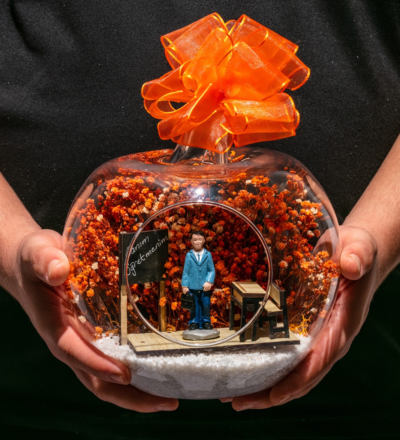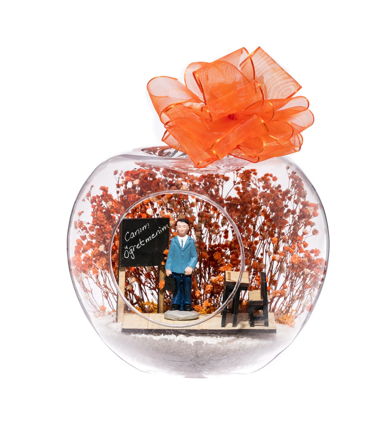 Küçük boy elma cam fanus içerisinde tasarladığımız bu kurdeleli teraryum, sevgili öğretmenlerimizi, gördükleri anda mutlu edecek şekilde tasarlandı. Tasarımımız; beyaz kum, kurutulmuş bitkilerle beraber bir adet CANIM ÖĞRETMENİM yazılı kara tahtalı sınıf görseli ve bir adet erkek objeyle tamamlanmıştır. Ev ve ofis ortamlarının tamamında sergilenebilir teraryumun içinde, kurutulmuş bitkiler bulunduğundan hava alması önemlidir. Açık olan kısmının kapatılmaması veya büfe vb. kapalı alanlara konulmaması gereklidir. Özellikle her ortamda, zevkle izlenebilecek çok özel bir teraryumdur. Yaklaşık Ölçüleri: 20x20cm NOT: Teraryumlarda kullanılan camlar, üfleme cam işçiliğiyle üretildiğinden bazı detaylarda farklılıklar gözlenebilir. Örneğin, sap kısmı ve ağız bitiş noktalarının her biri kendine özgüdür.