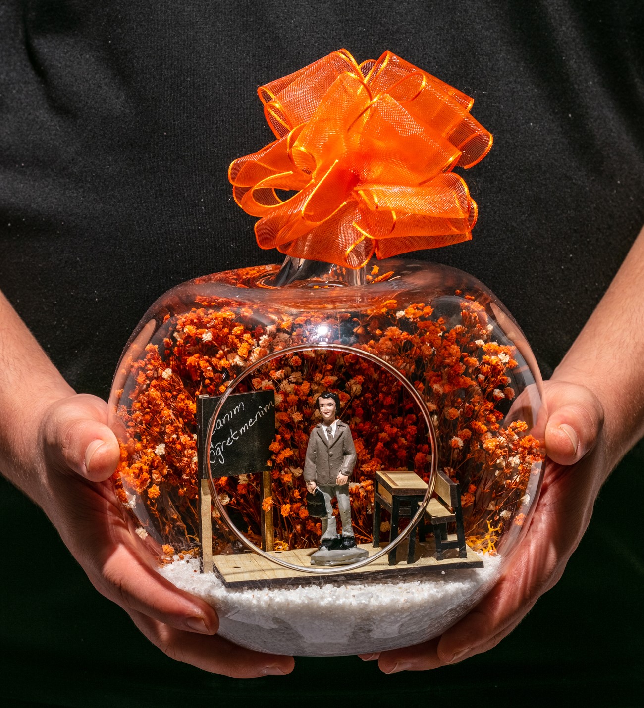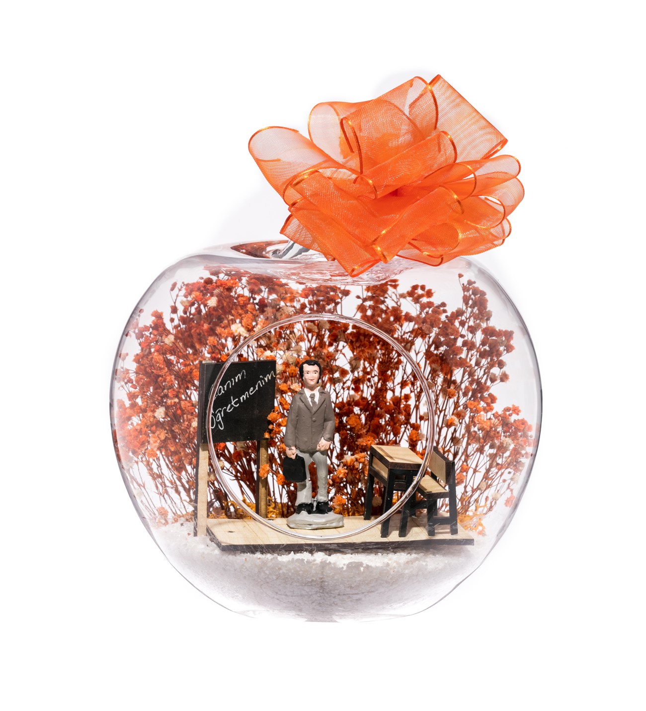 Küçük boy elma cam fanus içerisinde tasarladığımız bu kurdeleli teraryum, sevgili öğretmenlerimizi, gördükleri anda mutlu edecek şekilde tasarlandı. Tasarımımız; beyaz kum, kurutulmuş bitkilerle beraber bir adet CANIM ÖĞRETMENİM yazılı kara tahtalı sınıf görseli ve bir adet erkek objeyle tamamlanmıştır. Ev ve ofis ortamlarının tamamında sergilenebilir teraryumun içinde, kurutulmuş bitkiler bulunduğundan hava alması önemlidir. Açık olan kısmının kapatılmaması veya büfe vb. kapalı alanlara konulmaması gereklidir. Özellikle her ortamda, zevkle izlenebilecek çok özel bir teraryumdur. Yaklaşık Ölçüleri: 20x20cm NOT: Teraryumlarda kullanılan camlar, üfleme cam işçiliğiyle üretildiğinden bazı detaylarda farklılıklar gözlenebilir. Örneğin, sap kısmı ve ağız bitiş noktalarının her biri kendine özgüdür.