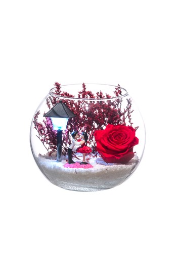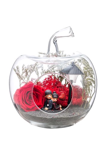 Küçük boy elma cam fanus içerisinde tasarladığımız bu kurdeleli teraryum, sevgili öğretmenlerimizi, gördükleri anda mutlu edecek şekilde tasarlandı. Tasarımımız; beyaz kum, kurutulmuş bitkilerle beraber bir adet CANIM ÖĞRETMENİM yazılı kara tahtalı sınıf görseli ve bir adet bayan objeyle tamamlanmıştır. Ev ve ofis ortamlarının tamamında sergilenebilir teraryumun içinde, kurutulmuş bitkiler bulunduğundan hava alması önemlidir. Açık olan kısmının kapatılmaması veya büfe vb. kapalı alanlara konulmaması gereklidir. Özellikle her ortamda, zevkle izlenebilecek çok özel bir teraryumdur. Yaklaşık Ölçüleri: 20x20cm NOT: Teraryumlarda kullanılan camlar, üfleme cam işçiliğiyle üretildiğinden bazı detaylarda farklılıklar gözlenebilir. Örneğin, sap kısmı ve ağız bitiş noktalarının her biri kendine özgüdür.
