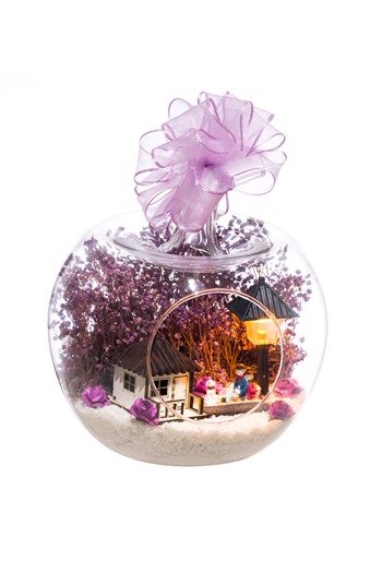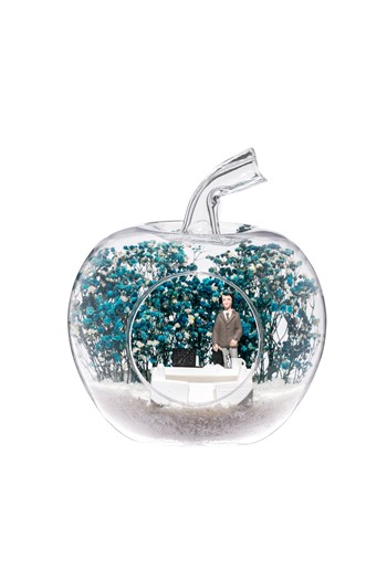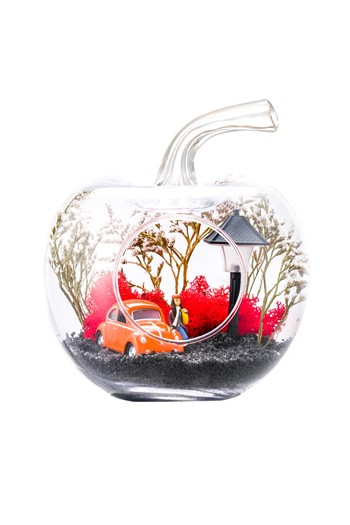 Kurdele takılı küçük boy elma cam fanus içerisinde tasarladığımız bu çok güzel teraryum; beyaz kum, şoklanmış yosunlar, kurutulmuş bitkiler, yapay çiçekler, bir adet taş ev ve bir adet bahçede anın tadını çıkaran kadın objelerle tamamlanmıştır. Ev ve ofis ortamlarının tamamında sergilenebilir teraryumun içinde, kurutulmuş ve şoklanmış bitkiler bulunduğundan hava alması önemlidir. Açık olan kısmının kapatılmaması veya büfe vb. kapalı alanlara konulmaması gereklidir. Özellikle her ortamda yıllarca, zevkle izlenebilecek özel bir teraryumdur. Yaklaşık Ölçüleri: 20x20cm NOT: Teraryumlarda kullanılan camlar, üfleme cam işçiliğiyle üretildiğinden bazı detaylarda farklılıklar gözlenebilir. Örneğin, sap kısmı ve ağız bitiş noktalarının her biri kendine özgüdür.