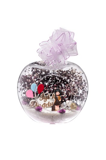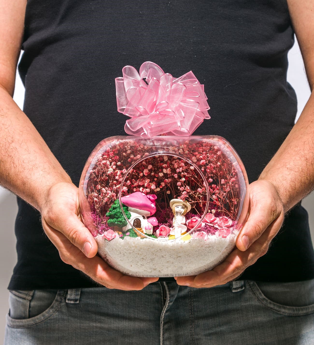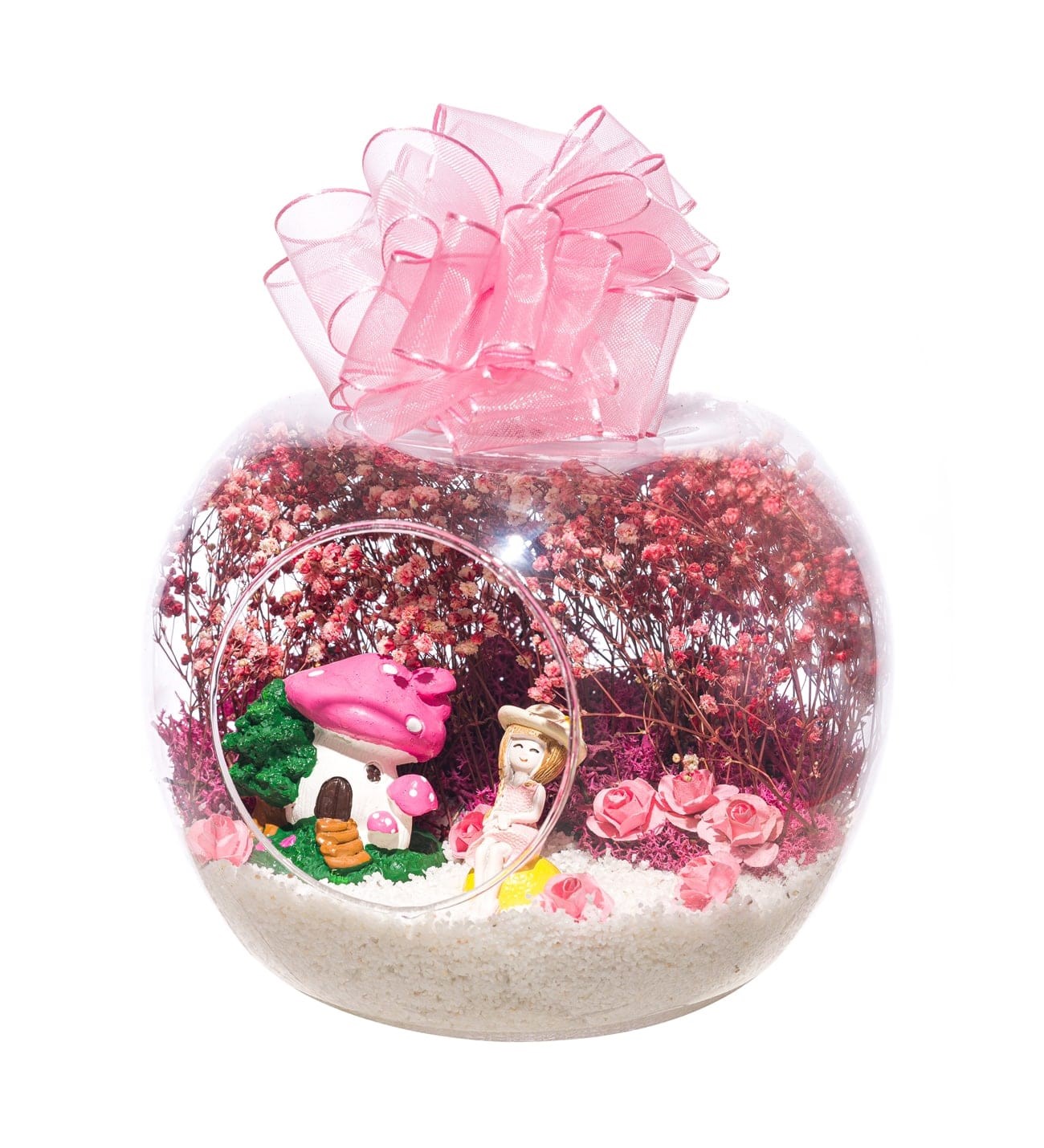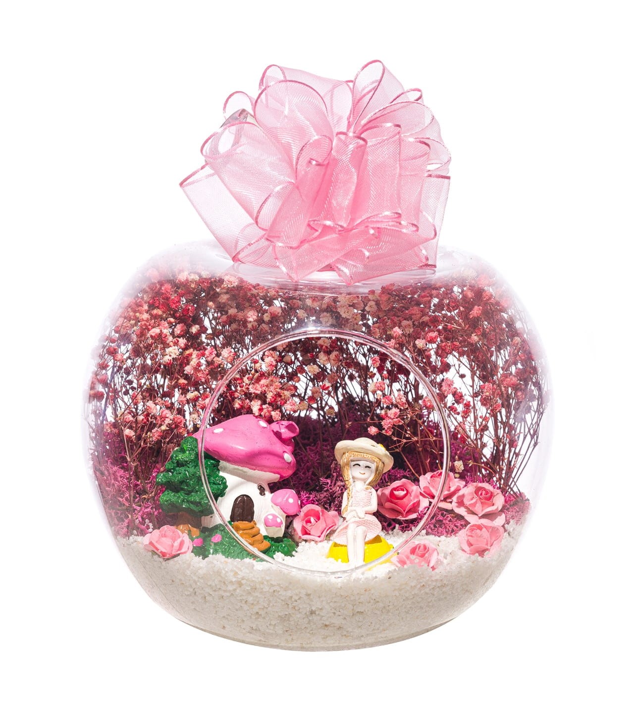 Kurdele takılı küçük boy elma cam fanus içerisinde tasarladığımız bu çok güzel teraryum; beyaz kum, şoklanmış yosunlar, kurutulmuş bitkiler, yapay çiçekler, bir adet taş mantar ev ve bir adet bahçede anın tadını çıkaran kadın objelerle tamamlanmıştır. Ev ve ofis ortamlarının tamamında sergilenebilir teraryumun içinde, kurutulmuş ve şoklanmış bitkiler bulunduğundan hava alması önemlidir. Açık olan kısmının kapatılmaması veya büfe vb. kapalı alanlara konulmaması gereklidir. Özellikle her ortamda yıllarca, zevkle izlenebilecek özel bir teraryumdur. Yaklaşık Ölçüleri: 20x20cm NOT: Teraryumlarda kullanılan camlar, üfleme cam işçiliğiyle üretildiğinden bazı detaylarda farklılıklar gözlenebilir. Örneğin, sap kısmı ve ağız bitiş noktalarının her biri kendine özgüdür.
