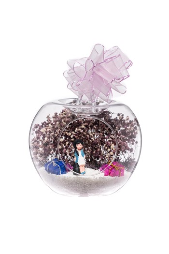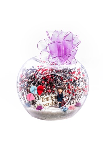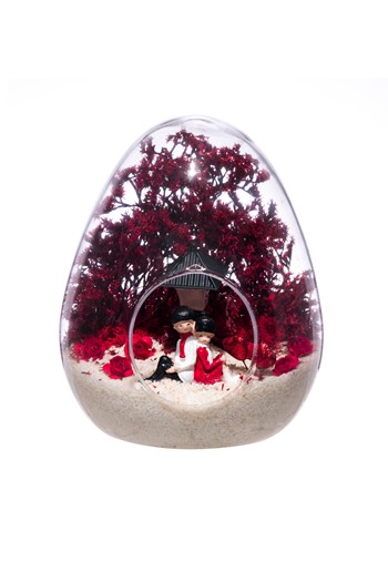 Küçük boy elma cam fanus içerisinde tasarladığımız bu çok güzel teraryum; beyaz kum, karışık renkli kurutulmuş bitkiler, renkli yapay mini güller, simli kalpler, bir adet ahşap ev ve bankta sırt sırta oturmuş, anı paylaşan aşıkları simgeleyen objeler kullanılarak tamamlanmıştır. Ev ve ofis ortamlarının tamamında sergilenebilir teraryumun içinde, kurutulmuş bitkiler bulunduğundan hava alması önemlidir. Açık olan kısmının kapatılmaması veya büfe vb. kapalı alanlara konulmaması gereklidir. Özellikle her ortamda yıllarca, zevkle izlenebilecek özel bir teraryumdur. Yaklaşık Ölçüleri: 20x20cm NOT: Teraryumlarda kullanılan camlar, üfleme cam işçiliğiyle üretildiğinden bazı detaylarda farklılıklar gözlenebilir. Örneğin, sap kısmı ve ağız bitiş noktalarının her biri kendine özgüdür.