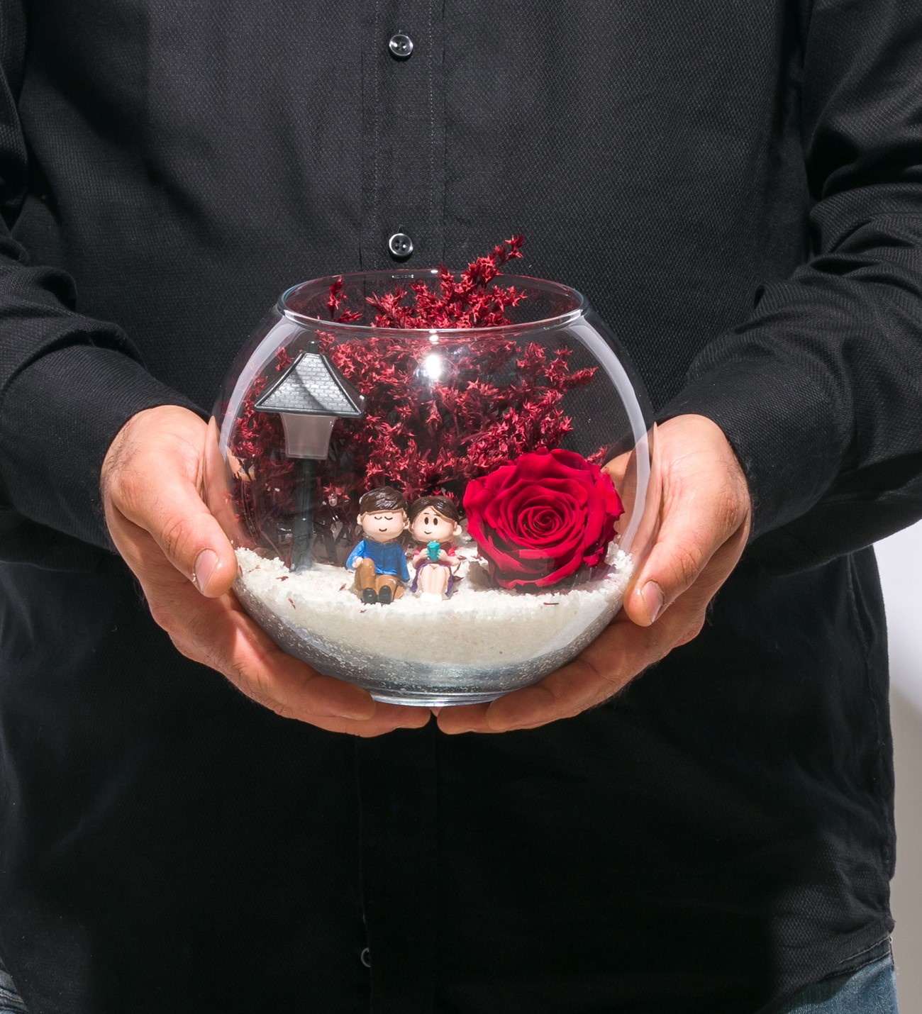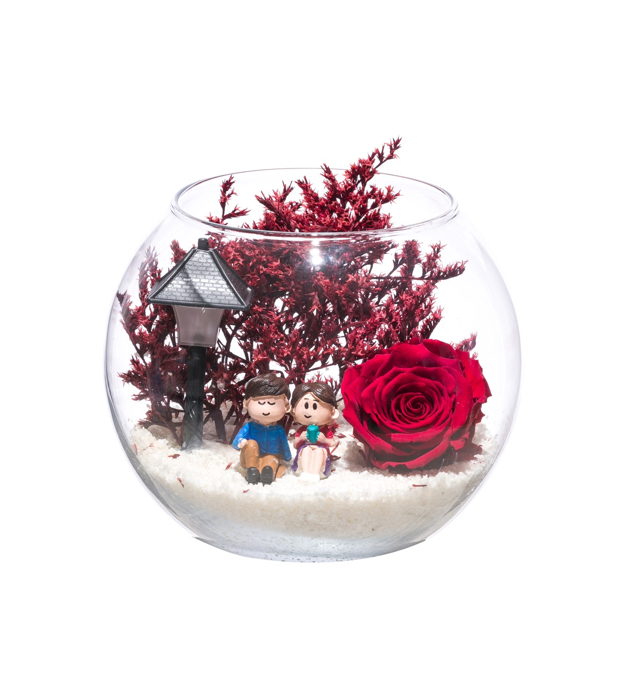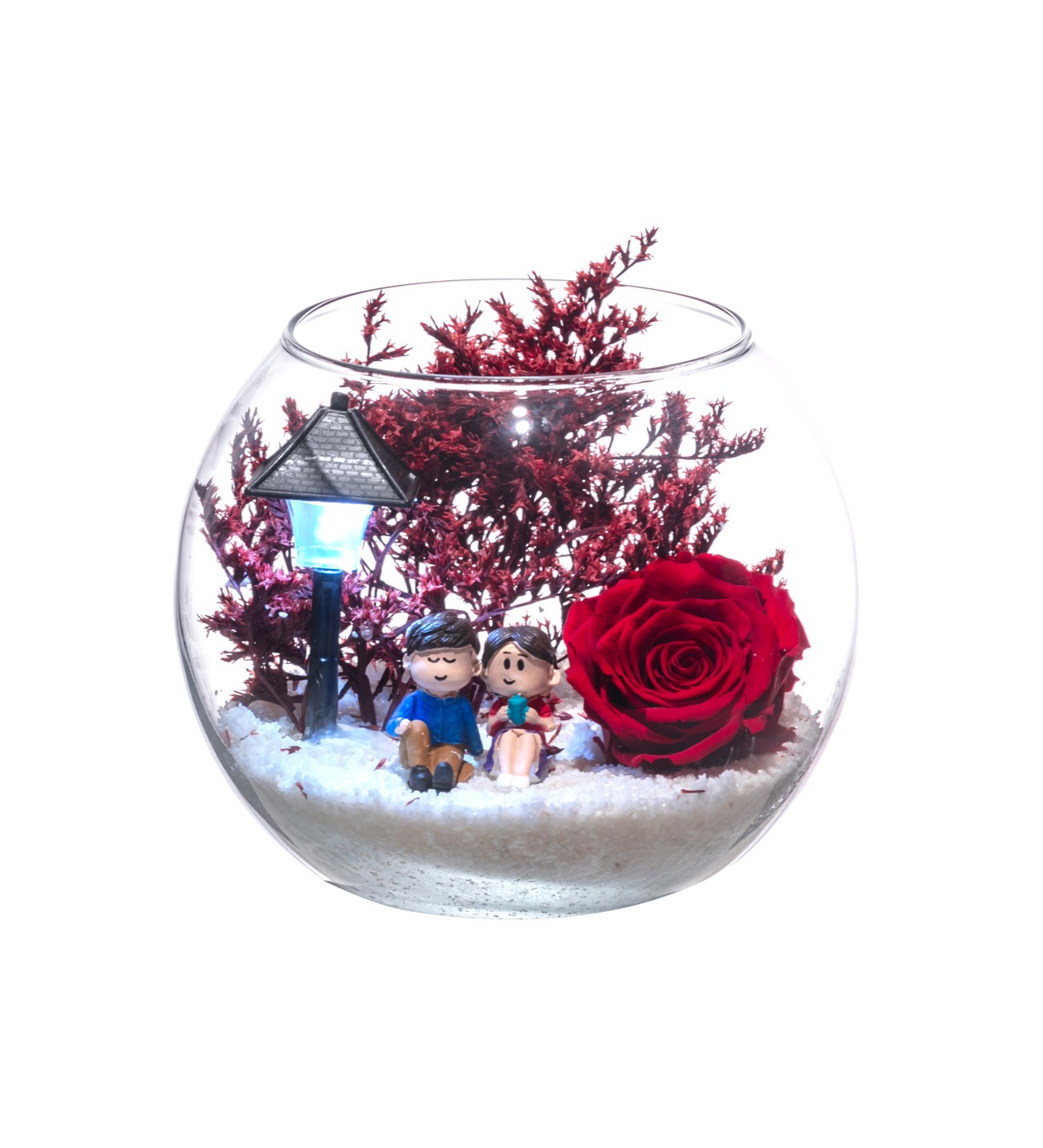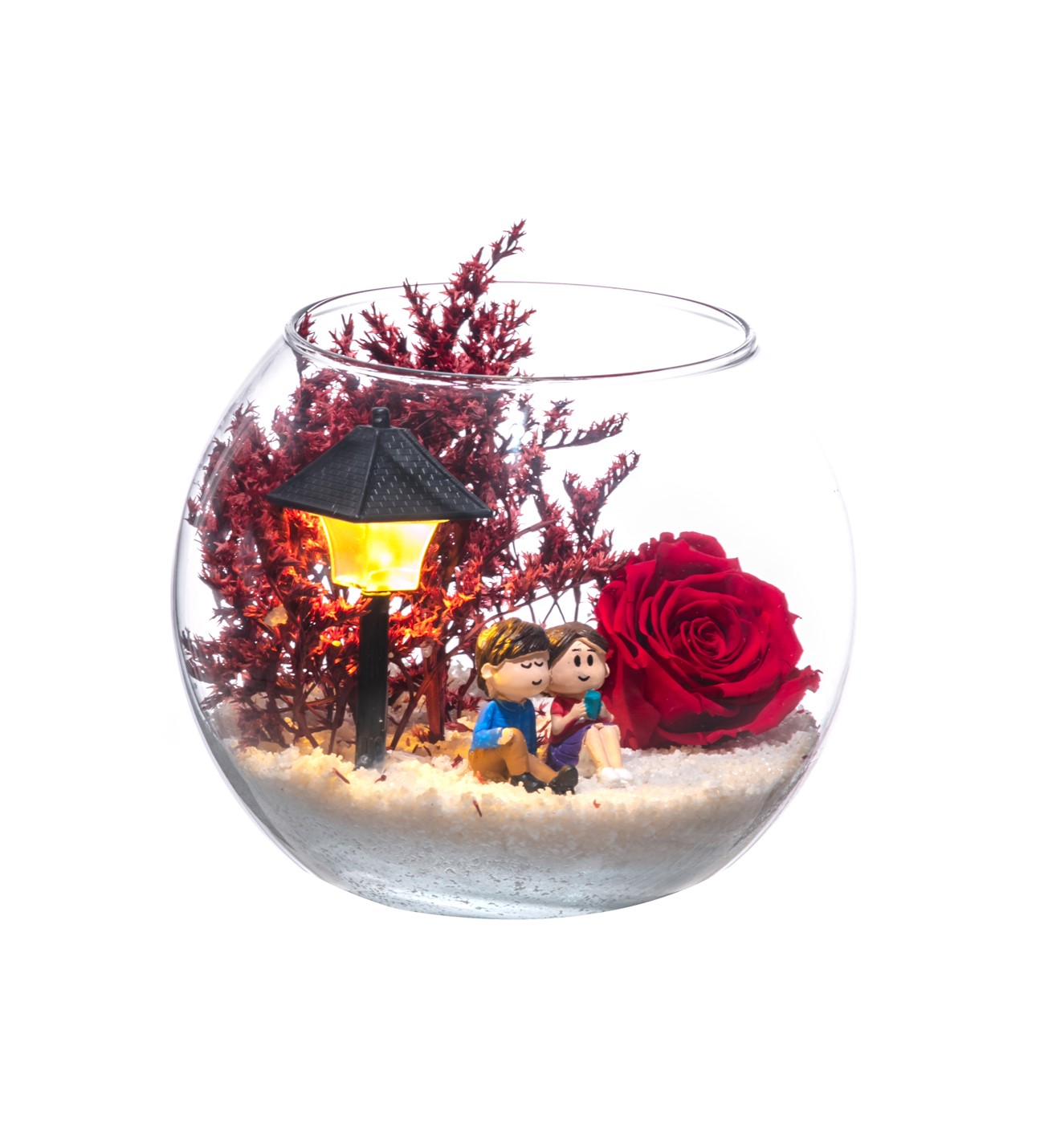 Küçük boy, Paşabahçe cam fanus içerisinde tasarladığımız bu alıcısına özel teraryum; beyaz kum, kurutulmuş bitkiler, bir adet ışığı iki farklı renkte yanan led sokak lambası görseli, bir adet yan yana sohbet eden aşıklar görseli ve bir adet şoklanmış gerçek gül kullanılarak sizler için tasarlanmıştır. Ev ve ofis ortamlarının tamamında sergilenebilir teraryumun içinde kurutulmuş bitkiler bulunduğundan hava alması önemlidir. Açık olan kısmının kapatılmaması veya büfe vb. kapalı alanlara konulmaması gereklidir. Özellikle her ortamda yıllarca, zevkle izlenebilecek özel bir teraryumdur. Yaklaşık Ölçüleri: 16x18 cm
