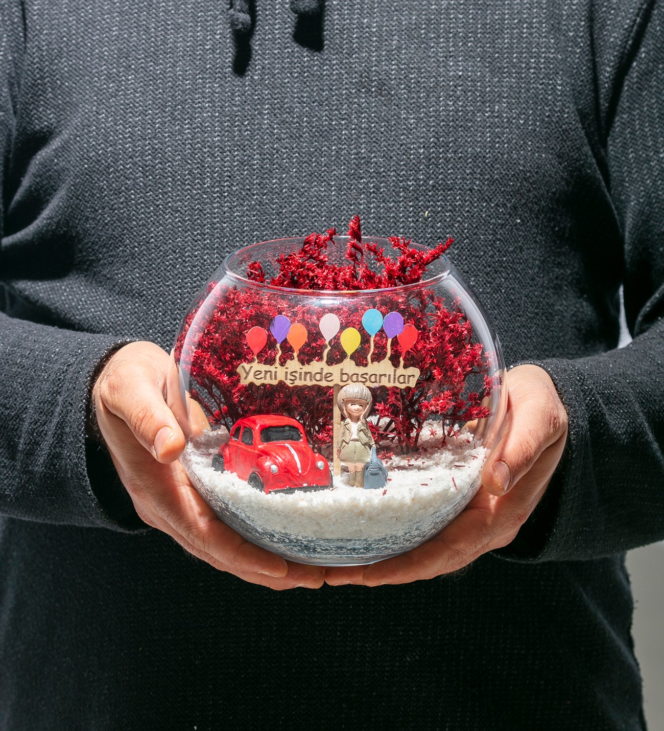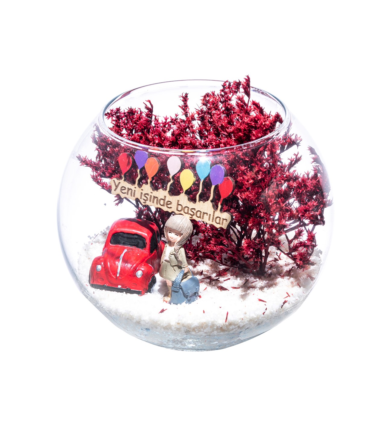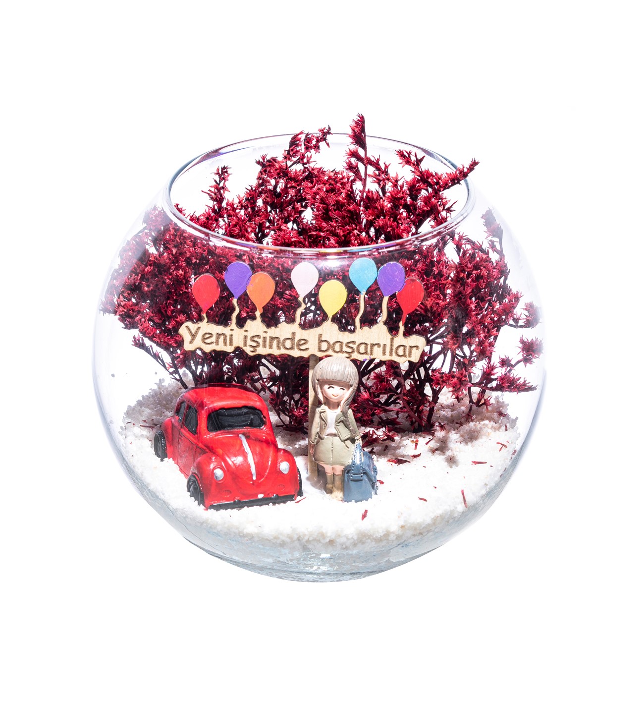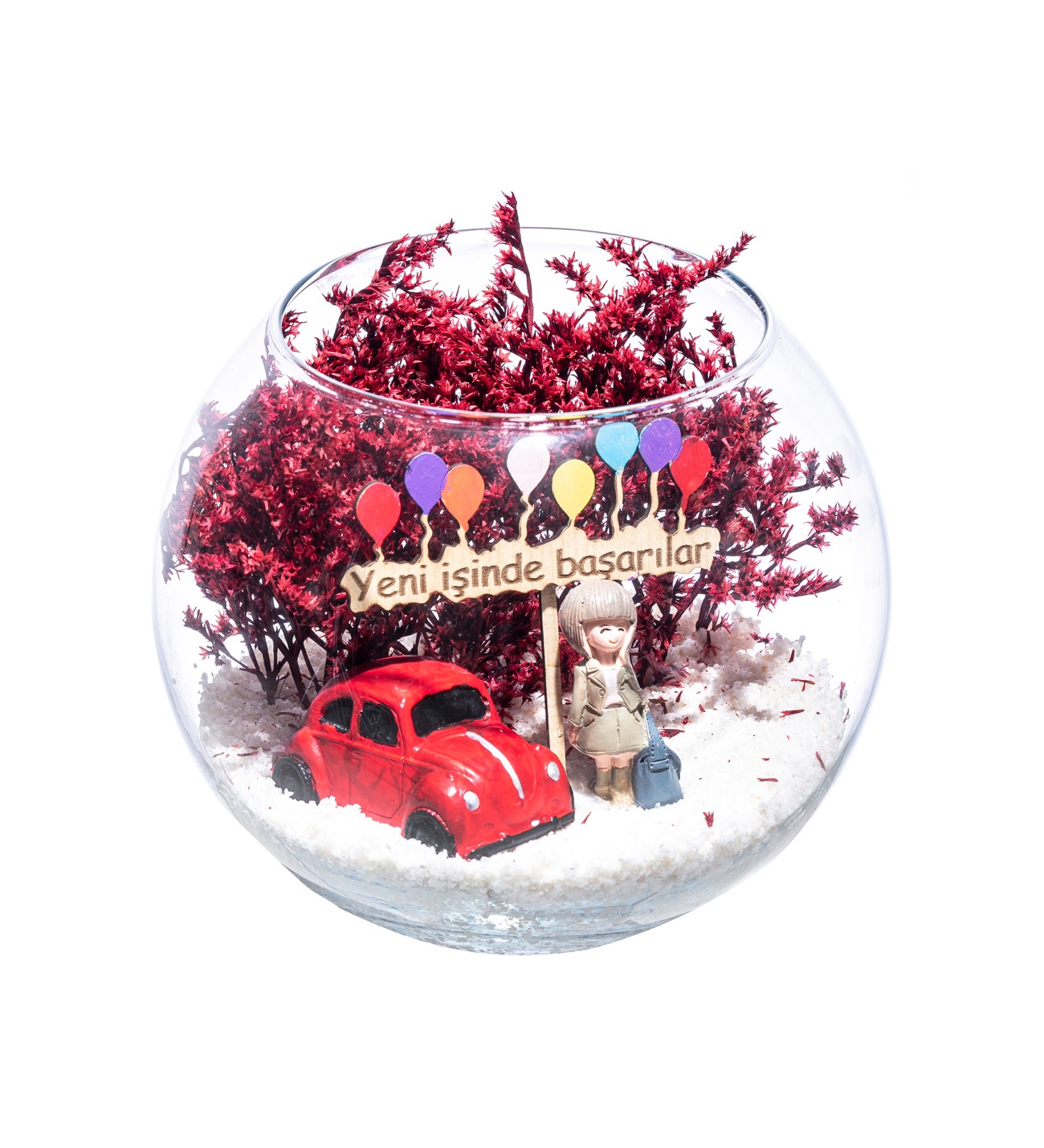 Küçük boy, cam fanus içerisinde tasarladığımız bu anlamlı teraryum; beyaz kum, kurutulmuş bitkiler, bir adet ahşap-balonlu YENİ İŞİNDE BAŞARILAR tabelası, bir adet otomobil görseli ve bir adet elinde çantasıyla yeni işine giden şık bir kadını simgeleyen objeyle tamamlanmıştır. Ev ve ofis ortamlarının tamamında sergilenebilir teraryumun içinde kurutulmuş bitkiler bulunduğundan hava alması önemlidir. Açık olan kısmının kapatılmaması veya büfe vb. kapalı alanlara konulmaması gereklidir. Özellikle her ortamda yıllarca, zevkle izlenebilecek özel bir teraryumdur. Yaklaşık Ölçüleri: 16x18 cm