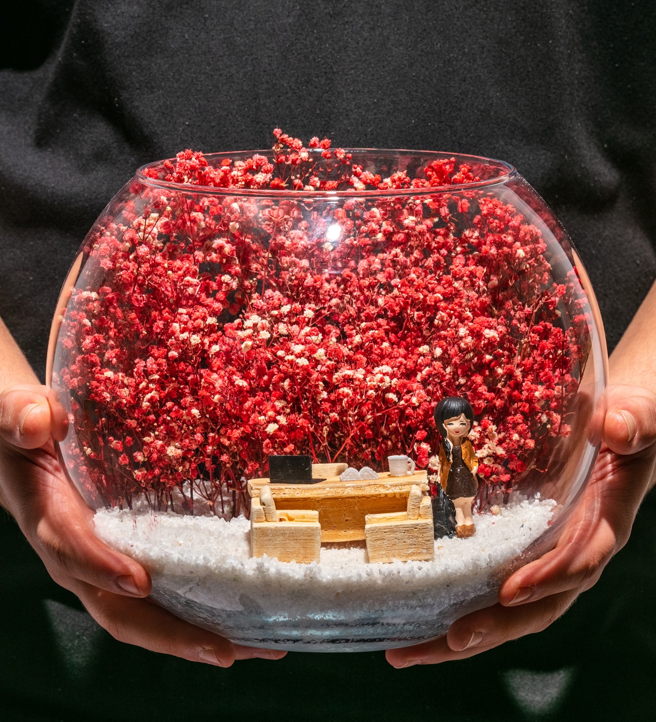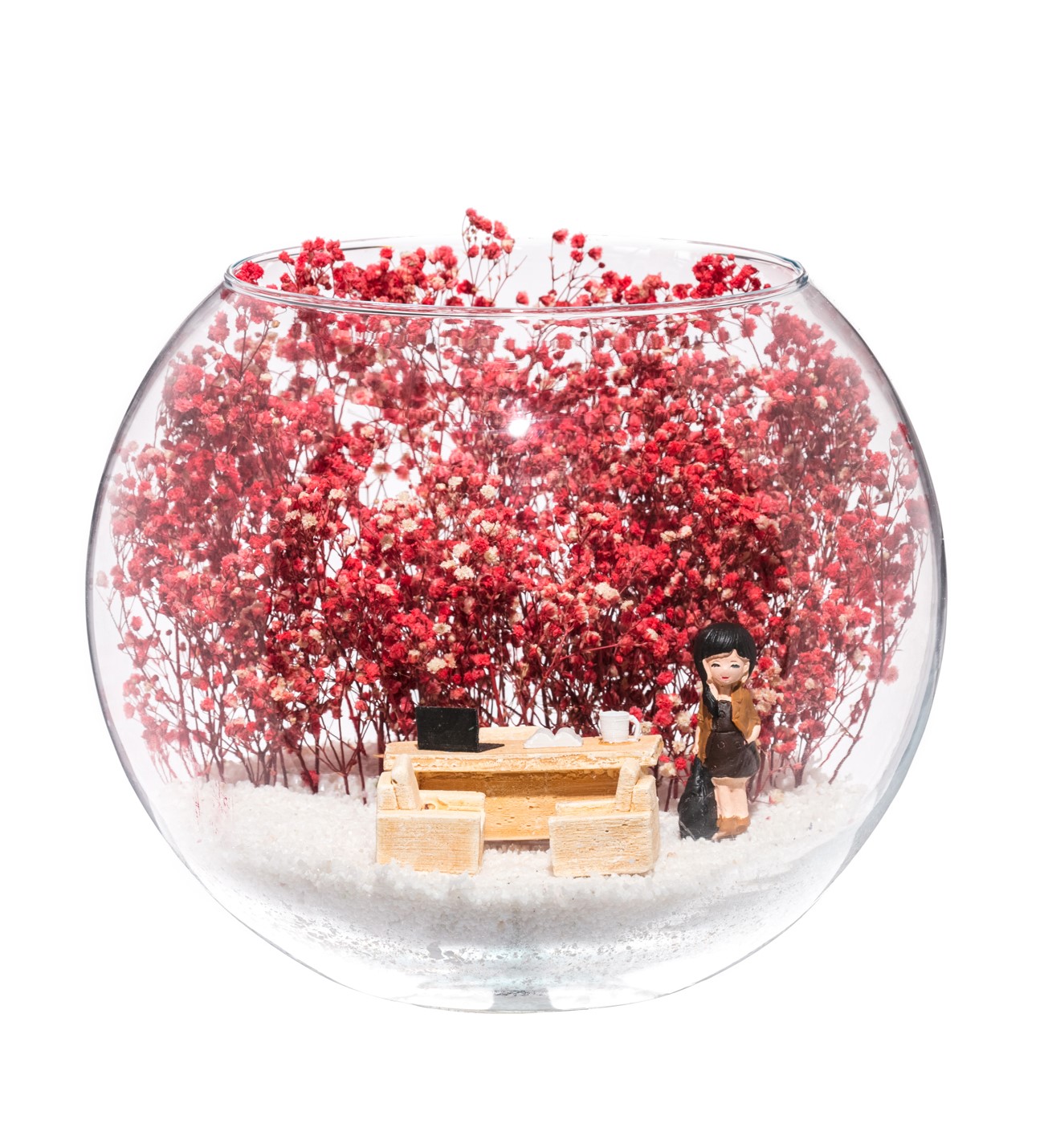 Orta boy açık cam fanus içerisinde hazırlanan bu özgün teraryum; beyaz kum, kurutulmuş bitkiler, bir adet mini ofis görseli ve bir adet çalışan bayanı simgeleyen objeyle birlikte kurgulanmıştır. Ev ve ofis ortamlarının tamamında sergilenebilir teraryumun içinde, kurutulmuş ve şoklanmış bitkiler bulunduğundan hava alması önemlidir. Açık olan kısmının kapatılmaması veya büfe vb. kapalı alanlara konulmaması gereklidir. Özellikle her ortamda zevkle izlenebilecek özel bir teraryumdur. Yaklaşık Ölçüler: 19x23 cm'dir.
