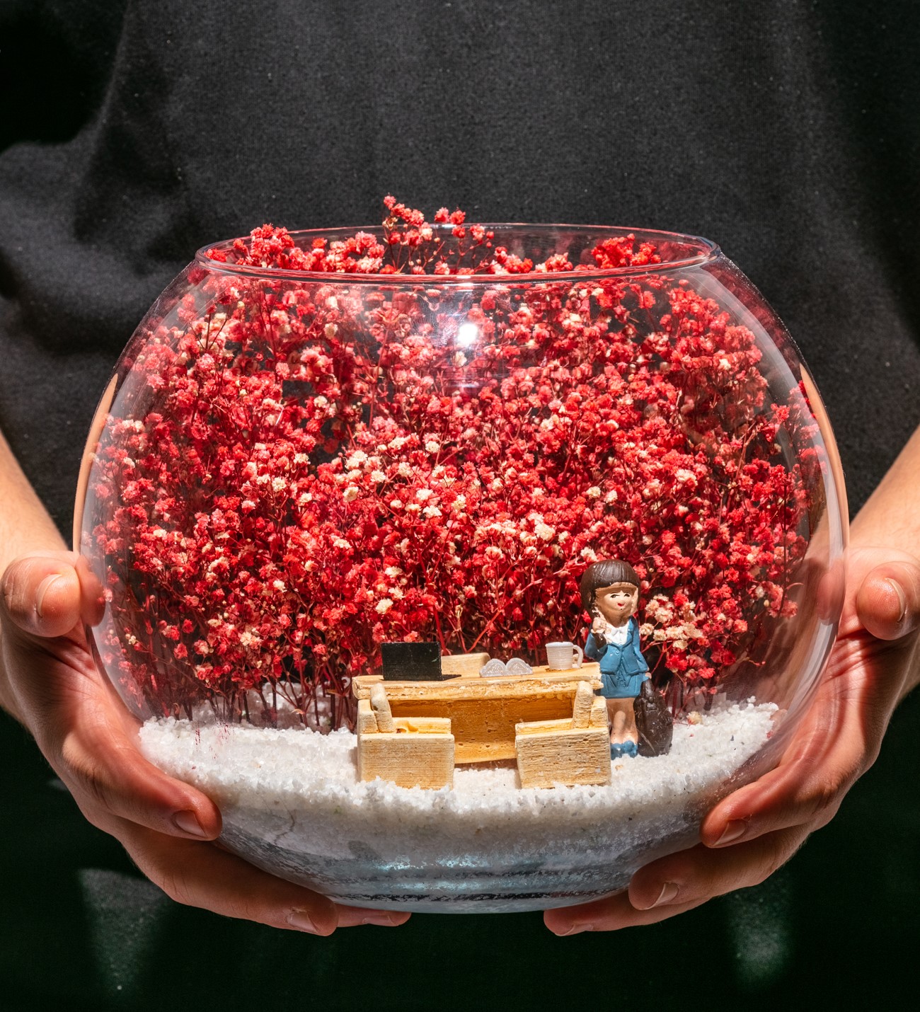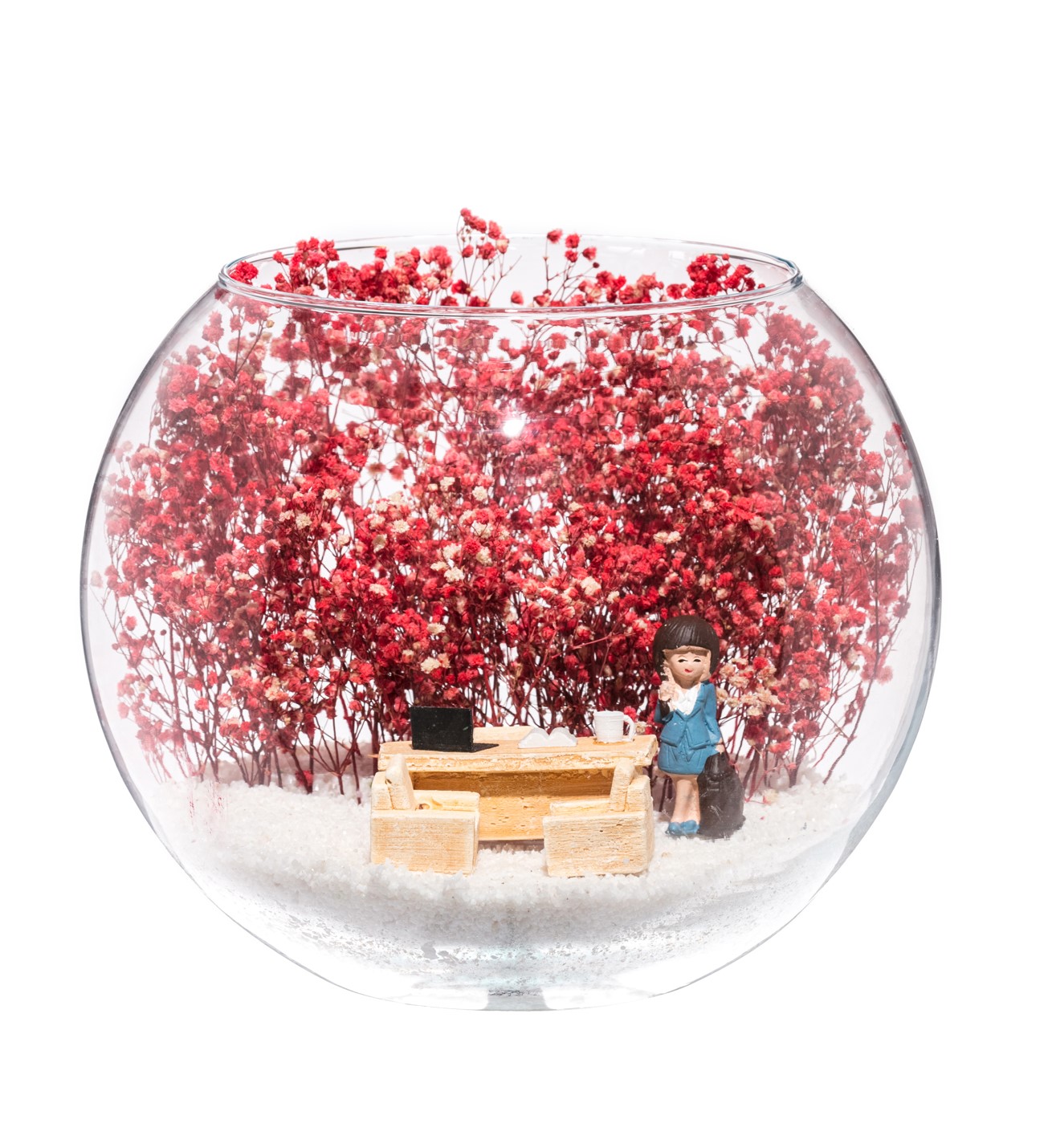 Orta boy açık cam fanus içerisinde hazırlanan bu özgün teraryum; beyaz kum, kurutulmuş bitkiler, bir adet mini ofis görseli ve bir adet çalışan bayanı simgeleyen objeyle birlikte kurgulanmıştır. Ev ve ofis ortamlarının tamamında sergilenebilir teraryumun içinde, kurutulmuş ve şoklanmış bitkiler bulunduğundan hava alması önemlidir. Açık olan kısmının kapatılmaması veya büfe vb. kapalı alanlara konulmaması gereklidir. Özellikle her ortamda zevkle izlenebilecek özel bir teraryumdur. Yaklaşık Ölçüler: 19x23 cm'dir.