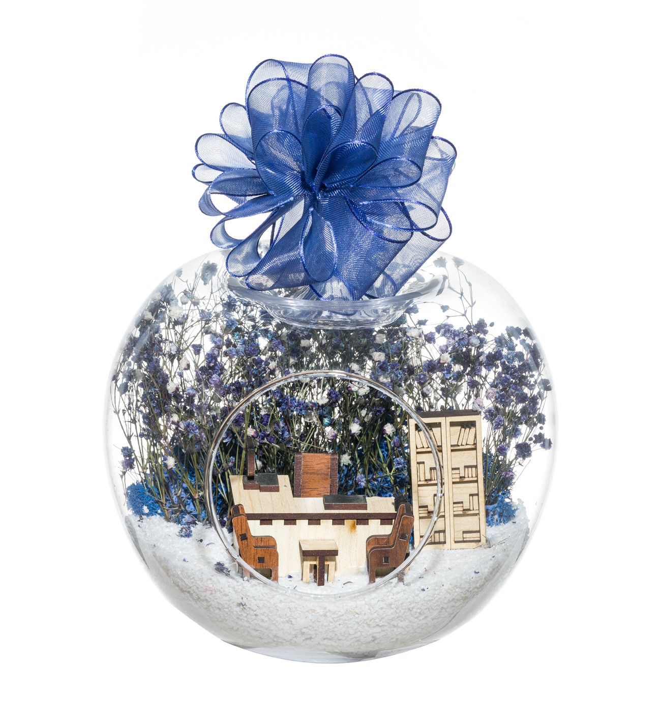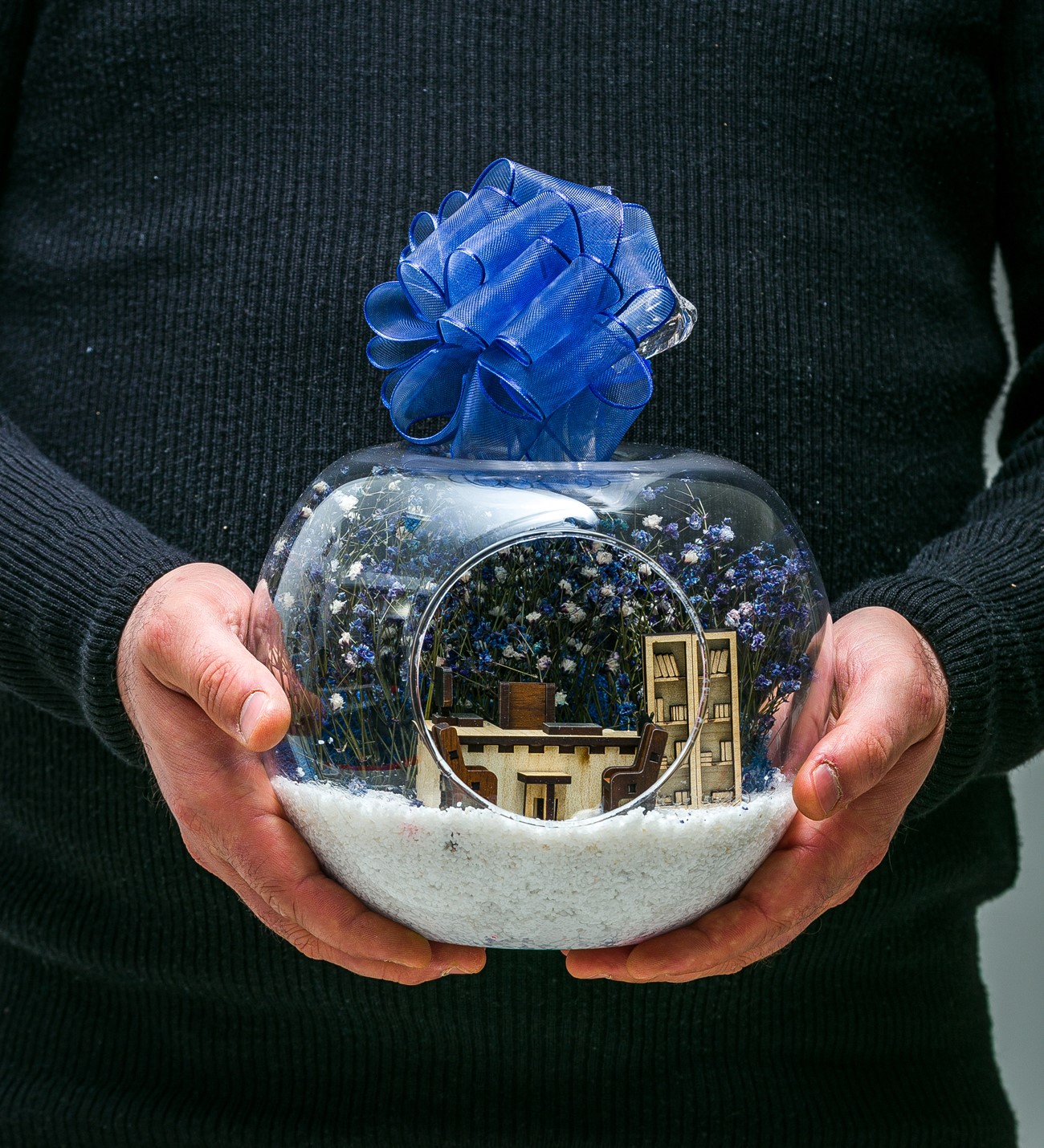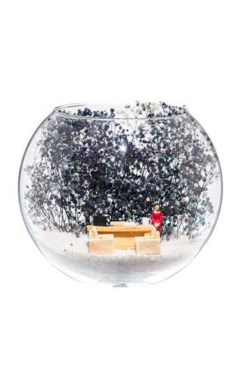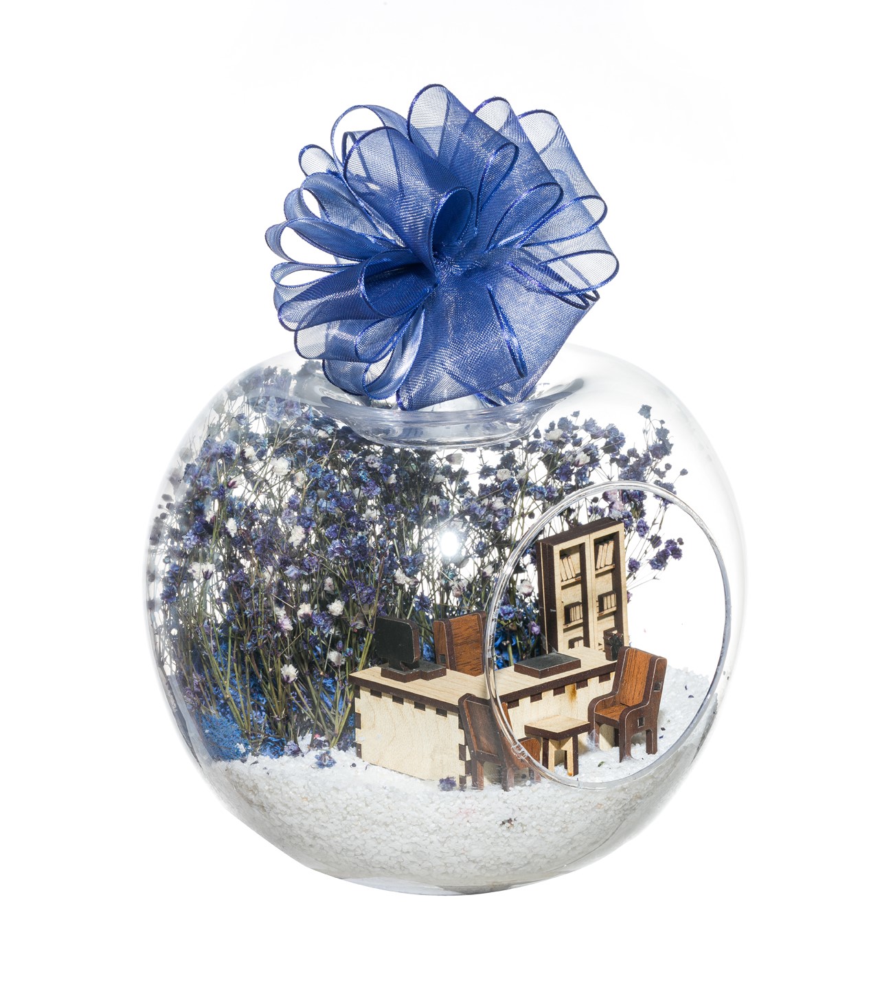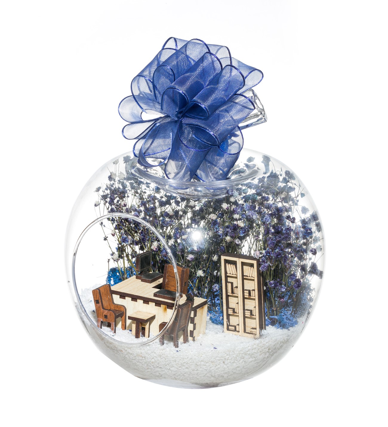 Kurdele takılı küçük boy elma cam fanus içerisinde tasarladığımız bu özel teraryum; beyaz kum, şoklanmış yosunlar, kurutulmuş bitkiler, bir adet üzerinde gerekli aksesuarları bulunan koltuğuyla ahşap ofis masası, önünde iki adet ahşap misafir koltuğu, bir adet sehpa ve içerisinde ahşap çalışma dolabı bulunan mükellef bir ofis görseli simgeleyen objelerle tamamlanmıştır. Ev ve ofis ortamlarının tamamında sergilenebilir teraryumun içinde, kurutulmuş ve şoklanmış bitkiler bulunduğundan hava alması önemlidir. Açık olan kısmının kapatılmaması veya büfe vb. kapalı alanlara konulmaması gereklidir. Özellikle her ortamda yıllarca, zevkle izlenebilecek özel bir teraryumdur. Yaklaşık Ölçüleri: 20x20cm NOT: Teraryumlarda kullanılan camlar, üfleme cam işçiliğiyle üretildiğinden bazı detaylarda farklılıklar gözlenebilir. Örneğin, sap kısmı ve ağız bitiş noktalarının her biri kendine özgüdür.