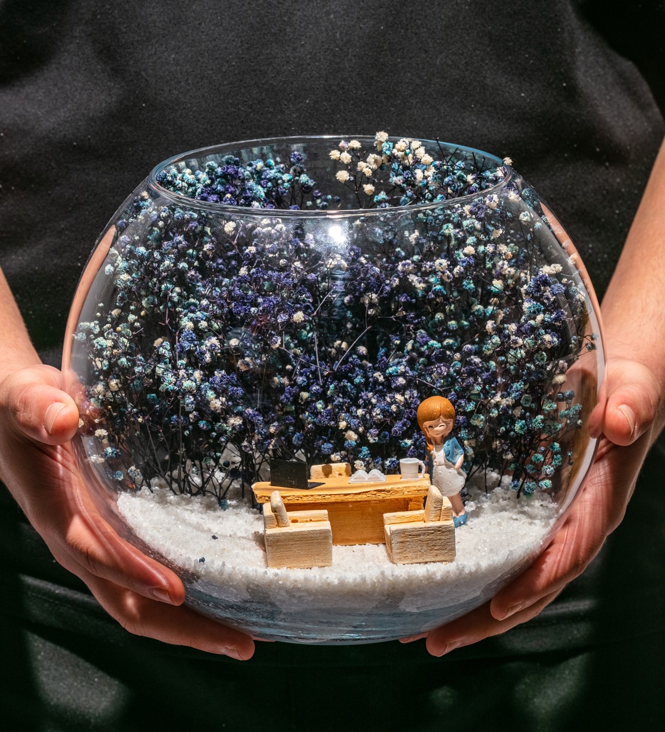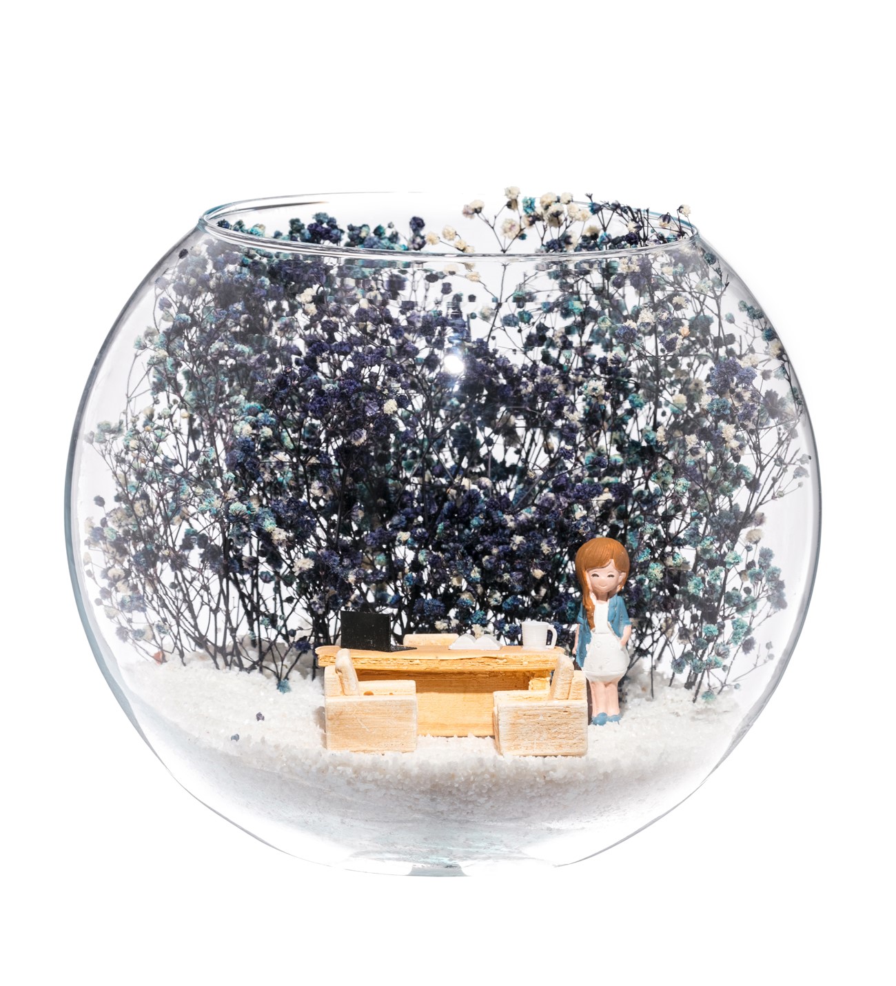 Orta boy açık cam fanus içerisinde hazırlanan bu özgün teraryum; beyaz kum, kurutulmuş bitkiler, bir adet mini ofis görseli ve bir adet çalışan bayanı simgeleyen objeyle birlikte kurgulanmıştır. Ev ve ofis ortamlarının tamamında sergilenebilir teraryumun içinde, kurutulmuş ve şoklanmış bitkiler bulunduğundan hava alması önemlidir. Açık olan kısmının kapatılmaması veya büfe vb. kapalı alanlara konulmaması gereklidir. Özellikle her ortamda zevkle izlenebilecek özel bir teraryumdur. Yaklaşık Ölçüler: 19x23 cm'dir.