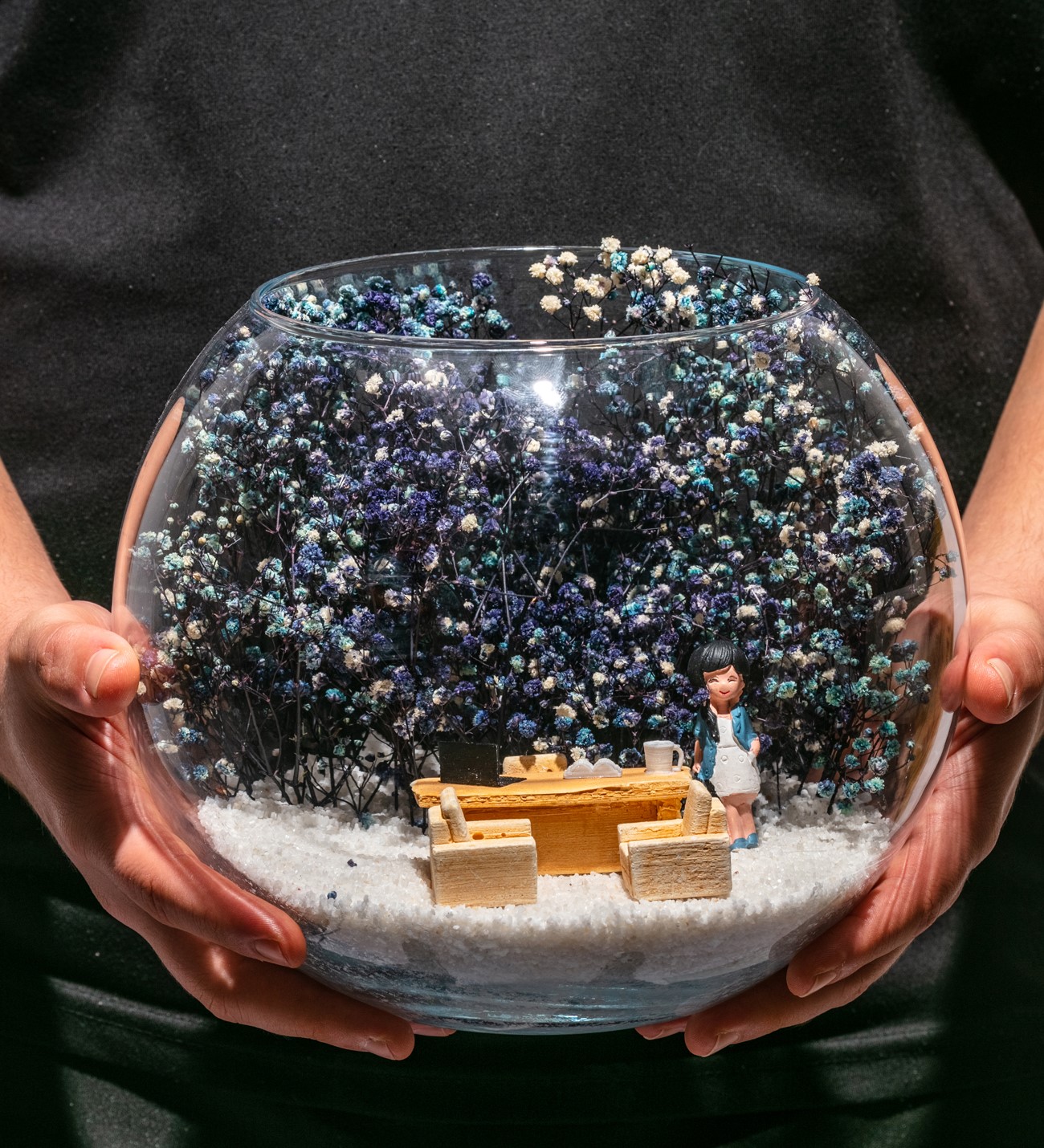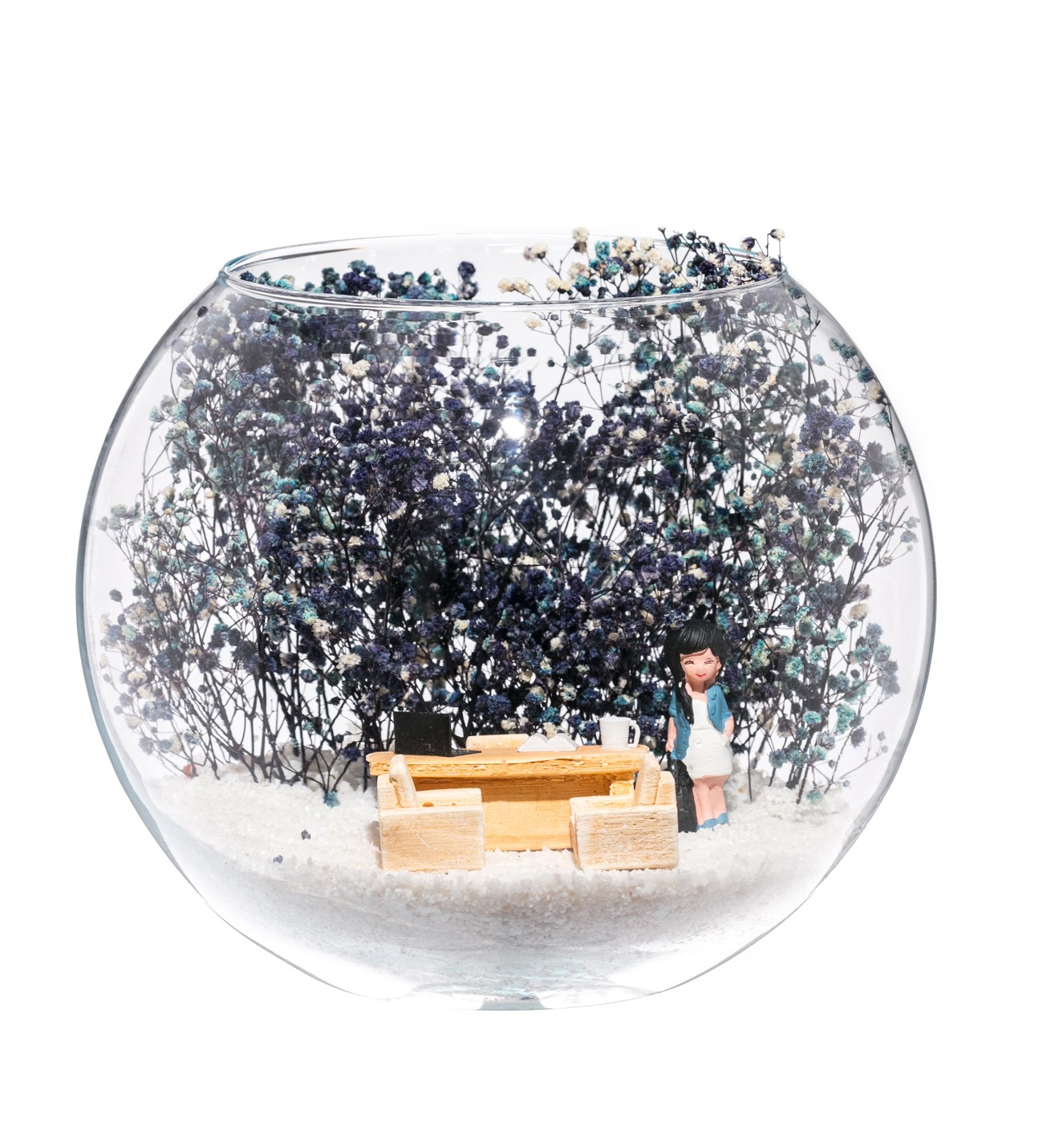 Orta boy açık cam fanus içerisinde hazırlanan bu özgün teraryum; beyaz kum, kurutulmuş bitkiler, bir adet mini ofis görseli ve bir adet çalışan bayanı simgeleyen objeyle birlikte kurgulanmıştır. Ev ve ofis ortamlarının tamamında sergilenebilir teraryumun içinde, kurutulmuş ve şoklanmış bitkiler bulunduğundan hava alması önemlidir. Açık olan kısmının kapatılmaması veya büfe vb. kapalı alanlara konulmaması gereklidir. Özellikle her ortamda zevkle izlenebilecek özel bir teraryumdur. Yaklaşık Ölçüler: 19x23 cm'dir.