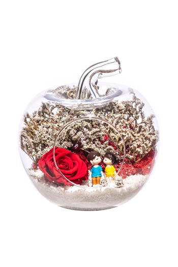 Orta boy açık cam fanus içerisinde hazırlanan bu özgün teraryum; beyaz kum, kurutulmuş bitkiler, bir adet mini ofis görseli ve bir adet çalışan bayanı simgeleyen objeyle birlikte kurgulanmıştır. Ev ve ofis ortamlarının tamamında sergilenebilir teraryumun içinde, kurutulmuş ve şoklanmış bitkiler bulunduğundan hava alması önemlidir. Açık olan kısmının kapatılmaması veya büfe vb. kapalı alanlara konulmaması gereklidir. Özellikle her ortamda zevkle izlenebilecek özel bir teraryumdur. Yaklaşık Ölçüler: 19x23 cm'dir.